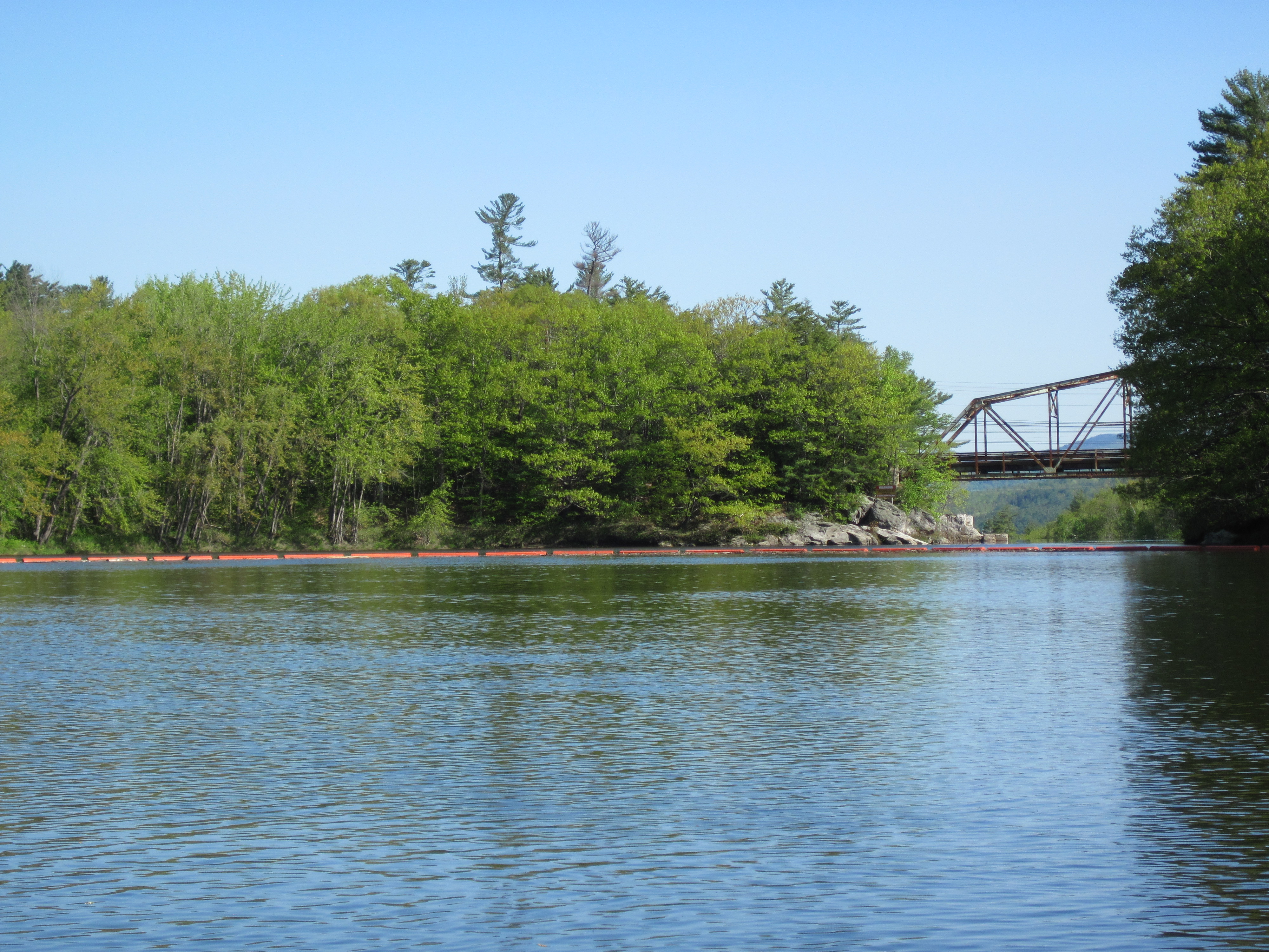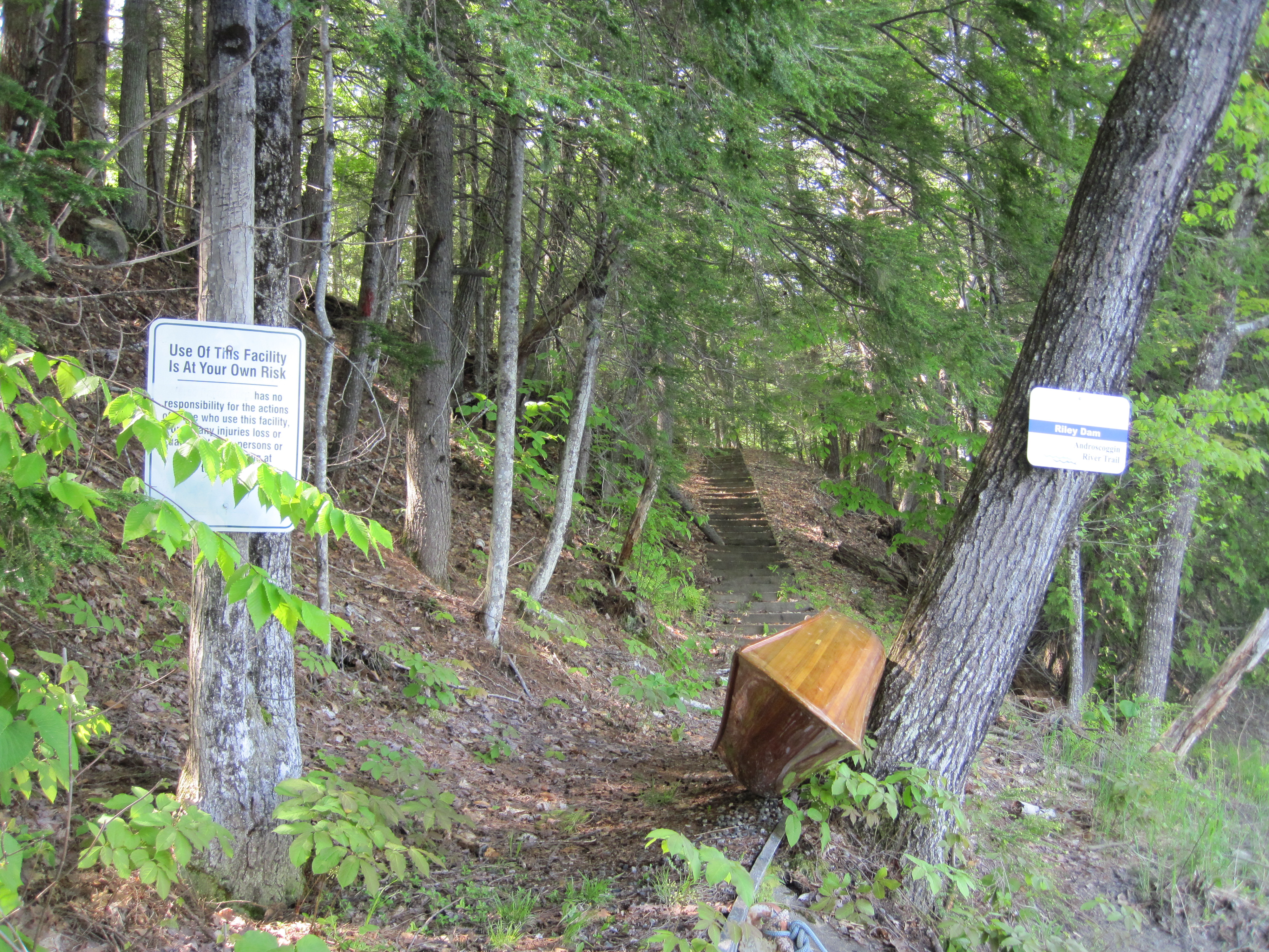 The water was slack to Rumford. The boat launch, where I might have taken out for the longer carry, merely offered an opportunity to use a Port-a-Potty. I then continued around the bend to a take out much nearer the dam, shaving maybe a mile and a half off the carry. I found an easy take-out, about 150 yards above the boom, leading to an ATV trail, and could have followed this, but chose instead to climb up to the parking area. This was to be the first carry and a significant one at 2 miles. My pack was still heavy, over 40 lb, and my legs had had no conditioning. A heavily twisted ankle in early April had precluded any significant training.