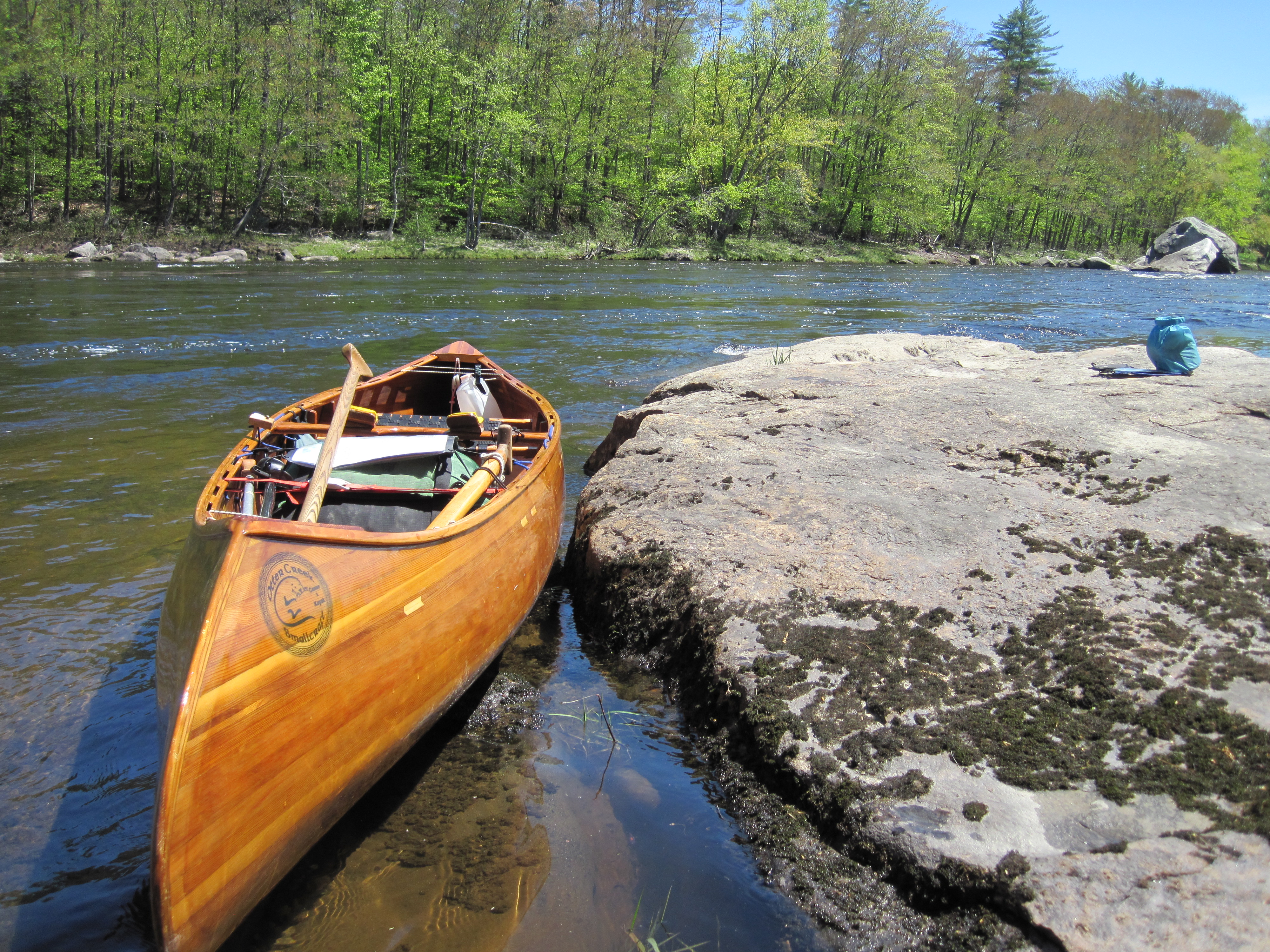 It seems that carrying a rather pretty canoe through a town in Maine is a good way to meet people. At least 6 people stopped to chat, some going out of their way to intercept me. The two miles of carry through Rumford therefore took about an hour, although this did also include some stops to admire and photograph the impressive falls. Having crossed the bridge over the Swift River, I turned left into a small park with access to this body of water, paddled it for a few yards and emerged back into the Androscoggin downstream of all the obstructions in Rumford.