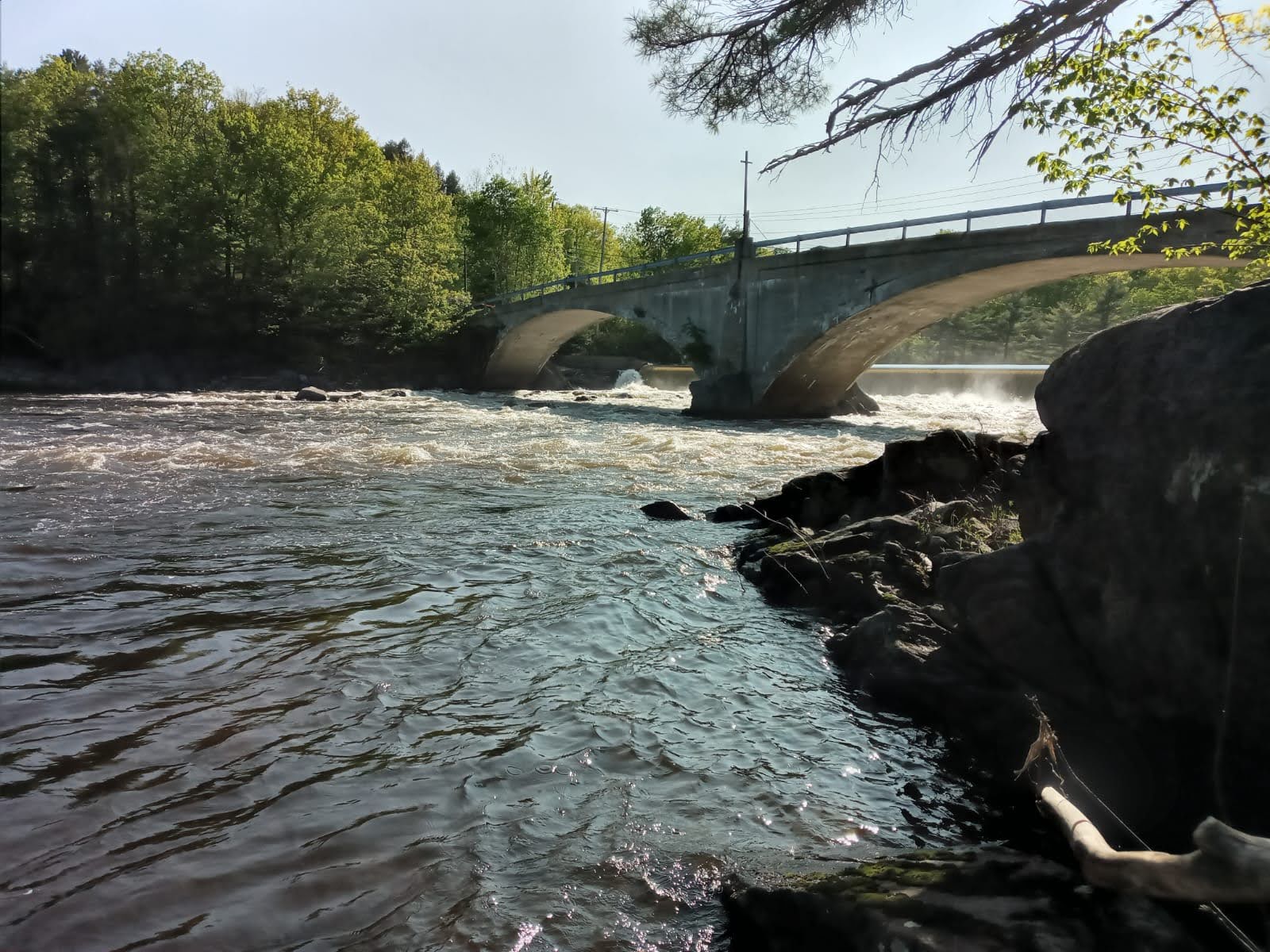 I continued past, coming shortly to Riley Dam. This took me by surprise as I had mis-marked it on my map. The take-out was muddy, but well signed, and the carry led up some steps to start. The put-in, however, was less well maintained. To reach the water required balancing on unstable rocks. And that was only the first hurdle. The only water access was into a vicious recirculating eddy, too fast to paddle against, and leading straight back into the main flow. This had heavy boils, creating slots which held the canoe. I have encountered such conditions before below some of the weirs and locks on the River Thames in England. They are uncomfortable, and require firm, confident handling. I kept my paddle blade in the water for support while applying enough power to shift me downstream.