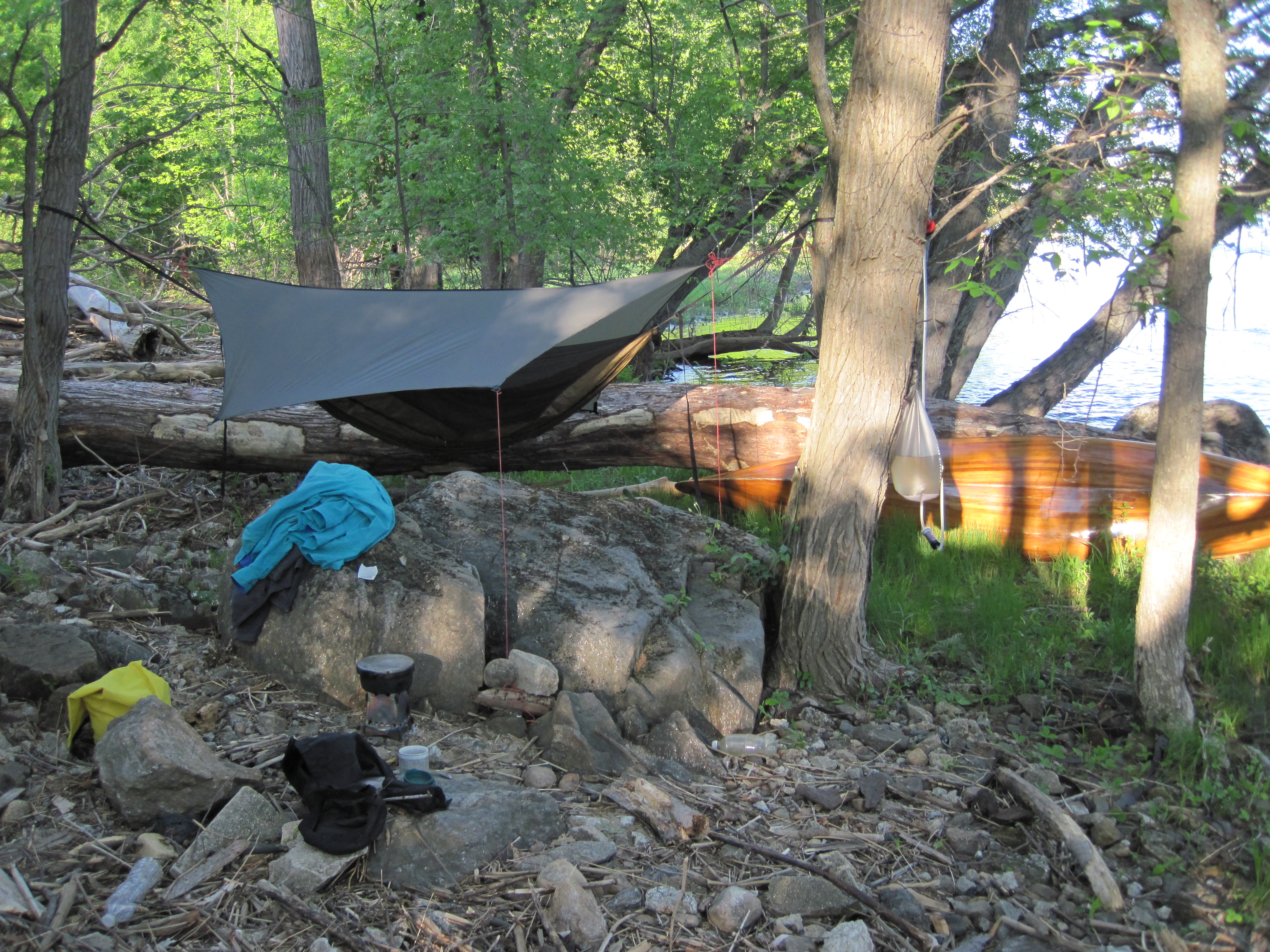 As I escaped the pull of Riley Dam, the cold wind died, and for a while I was hot for the first time today. It was a short, easy paddle to Jay Dam, a pair of dams either side of Pine Island. I took out through mud on to the island, followed the trail to below the dams, and put in through mud, before searching for a camping spot. Initially I headed for river-right, but then espied a secluded spot on Pine Island, so came back upstream to take out there. This was much less exposed to public view. I spent time picking up copious broken glass, stacking it all in one safe place. Then once it was safer to move around, I hung my hammock and used the large amounts of small, dry wood to fire up the wood-stove to cook a curry. Having arrived about 4:30 pm, I had finished eating and drinking, and was brushing my teeth by about 7:00 pm.