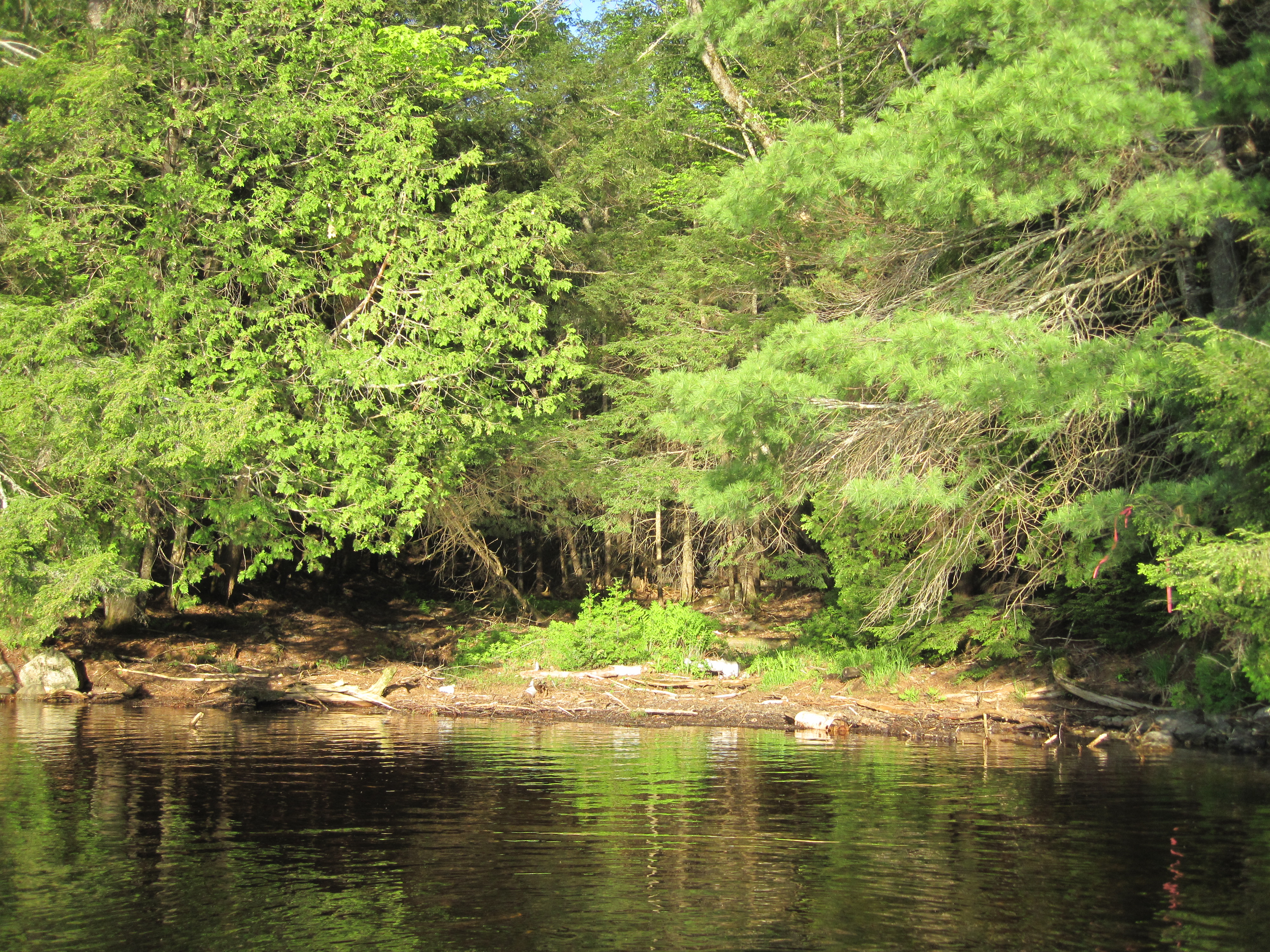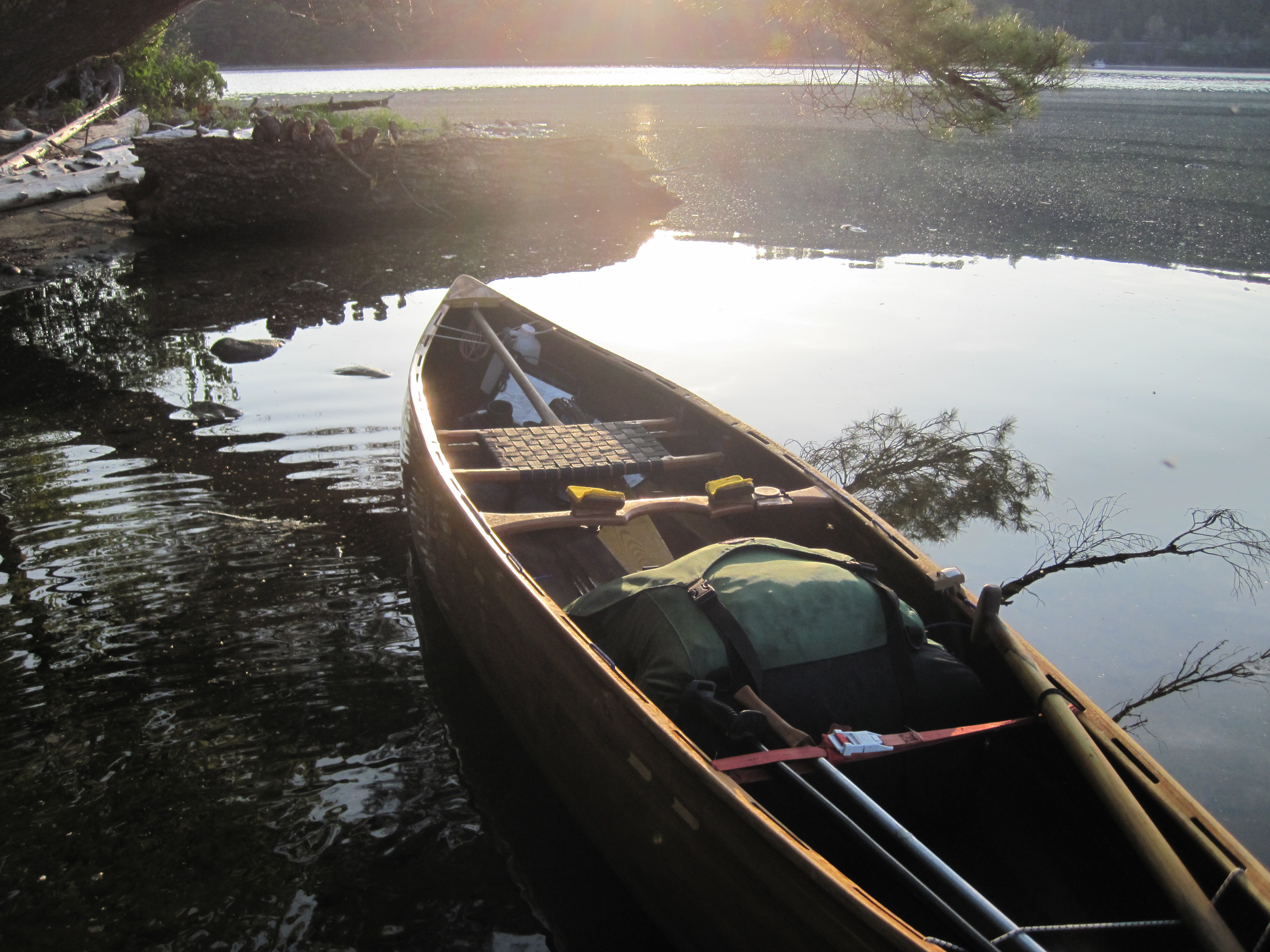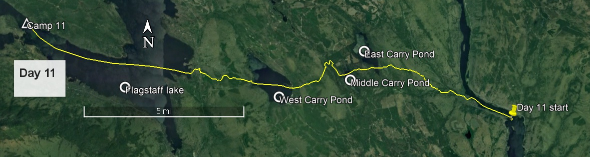 Today began and ended idyllically, but what came between was a different story. I was up early, planning to complete as much of the Great Carry as possible before the main heat of the day. This is the portage, nearly 11 miles, from Wyman Lake to Flagstaff Lake, punctuated by three small ponds: East, Middle & West Carry Ponds. The early paddling west on Wyman Lake was calm, wonderful for limbering up, the rising sun on my back. At the next bend, where the lake turns again to the north, and just south of the Carrying Place Stream, I found some pink flagging tape indicating the take-out. There was a clear path leading west to the road.