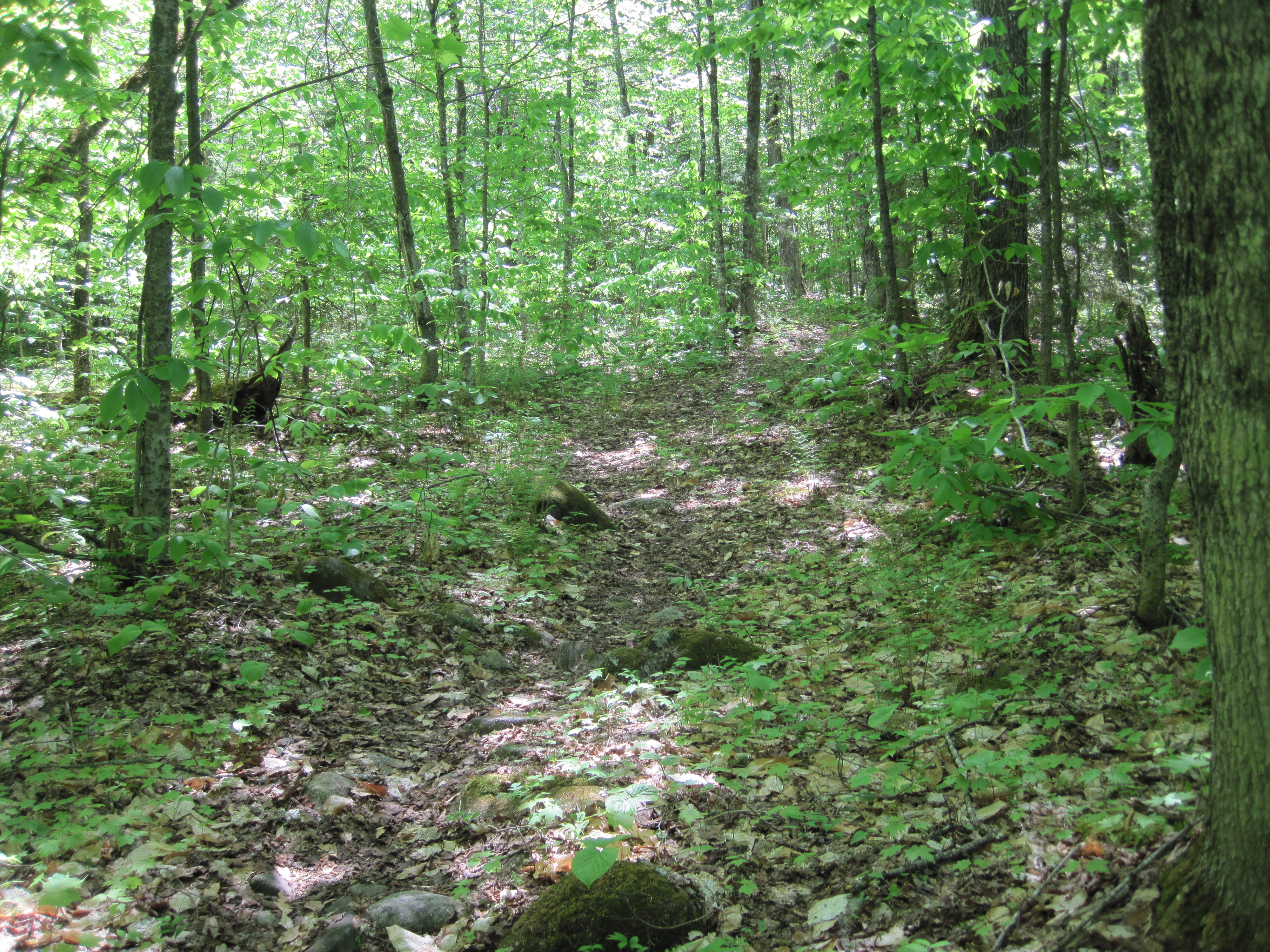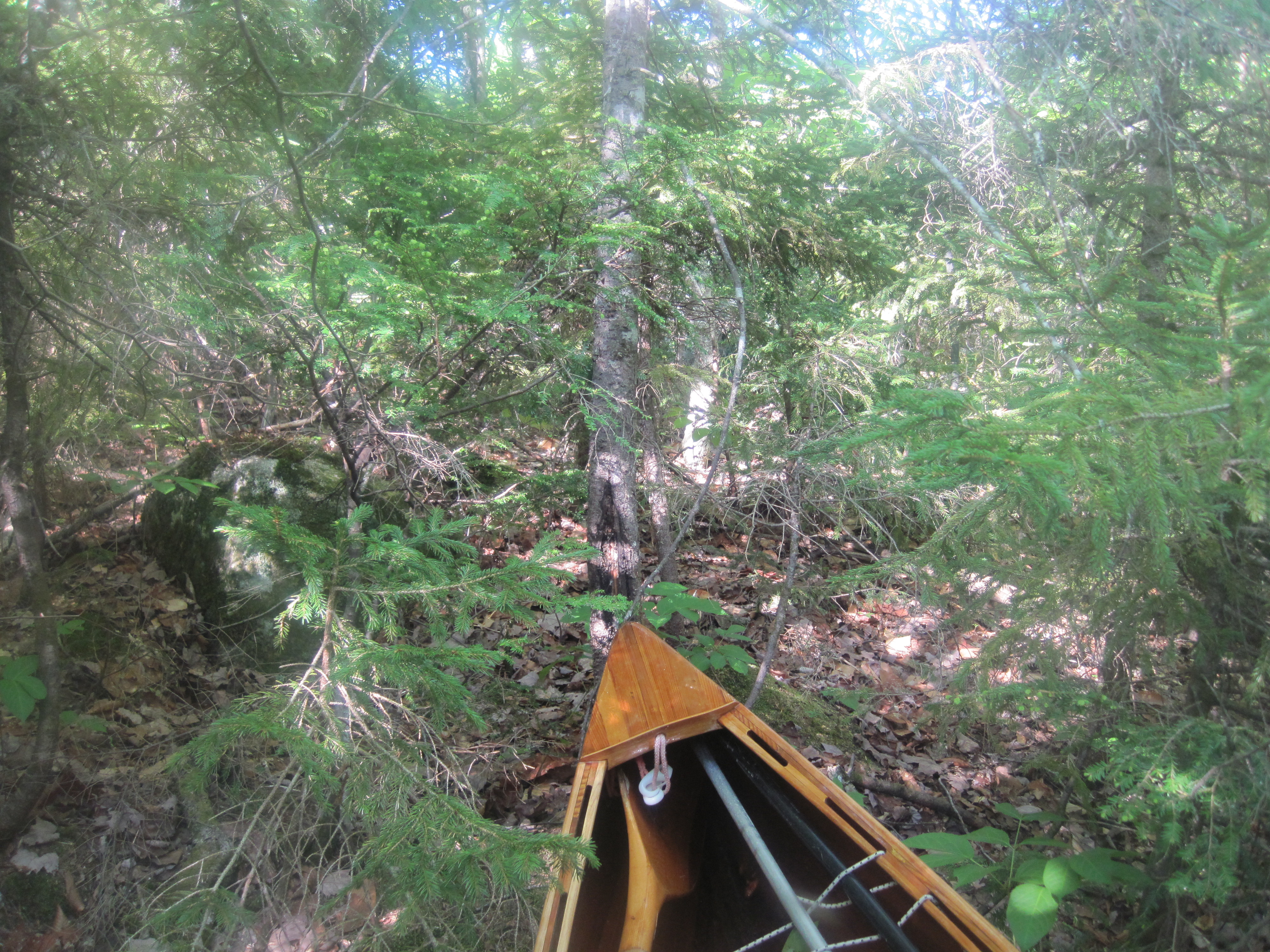 This trail became ever less distinct. The brain is enormously adept at seeing patterns, even where none exists. Maybe I was identifying a clear path even though there was none. The trail also became steep as I climbed out the south side of the Stony Brook valley, a tributary of the Carrying Place Stream. I knew that Arnold's men had grumbled at the amount of ascent, and was beginning to empathise. Eventually, even my brain recognised that I was not on any kind of recognisable trail. The young growth crowded in on me, leaving insufficient room to push the canoe through. Piles of rocks swallowed my shins as my feet descended into abysses. This was turning into another instance of my Mud Pond Carry debacle (see NFCT Through-Paddle, 2018, Day 5). I could not believe that I had been so stupid as to push this far before thinking about turning back. Now the route to retrace my steps was as uninviting as continuing forwards.