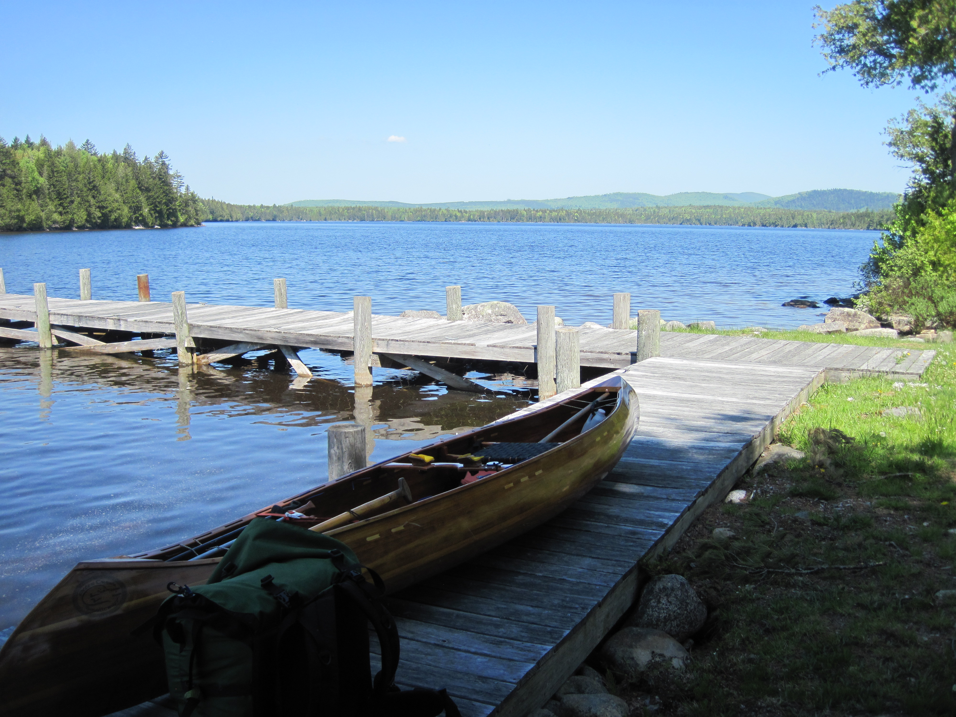 After a drink and a snack, I set out, now guided by the very obvious signposts. My legs trudged uselessly below me, offering little control. I had to make exaggerated movements to avoid roots and rocks, lest my feet merely collide with them, tripping me up. The remaining 1.7 miles to East Carry Pond took nearly an hour. When I arrived I was exhausted, hot, sticky, dehydrated, generally fried. The day was now hot, and I had wasted about 2 hours by getting lost. At East Carry Pond the trail crosses some private land at some cabins. Looking around for someone to ask permission, I saw someone working, so walked up to him and hailed him. Believing he was alone, his reaction was spectacular, complete shock as he jumped round. For permission he suggested I contact the owner who lived somewhere remote. This being unrealistic, I suggested I might merely cross to the pond and disappear with no trace. He agreed, and was kind enough to refill my water bottle.
