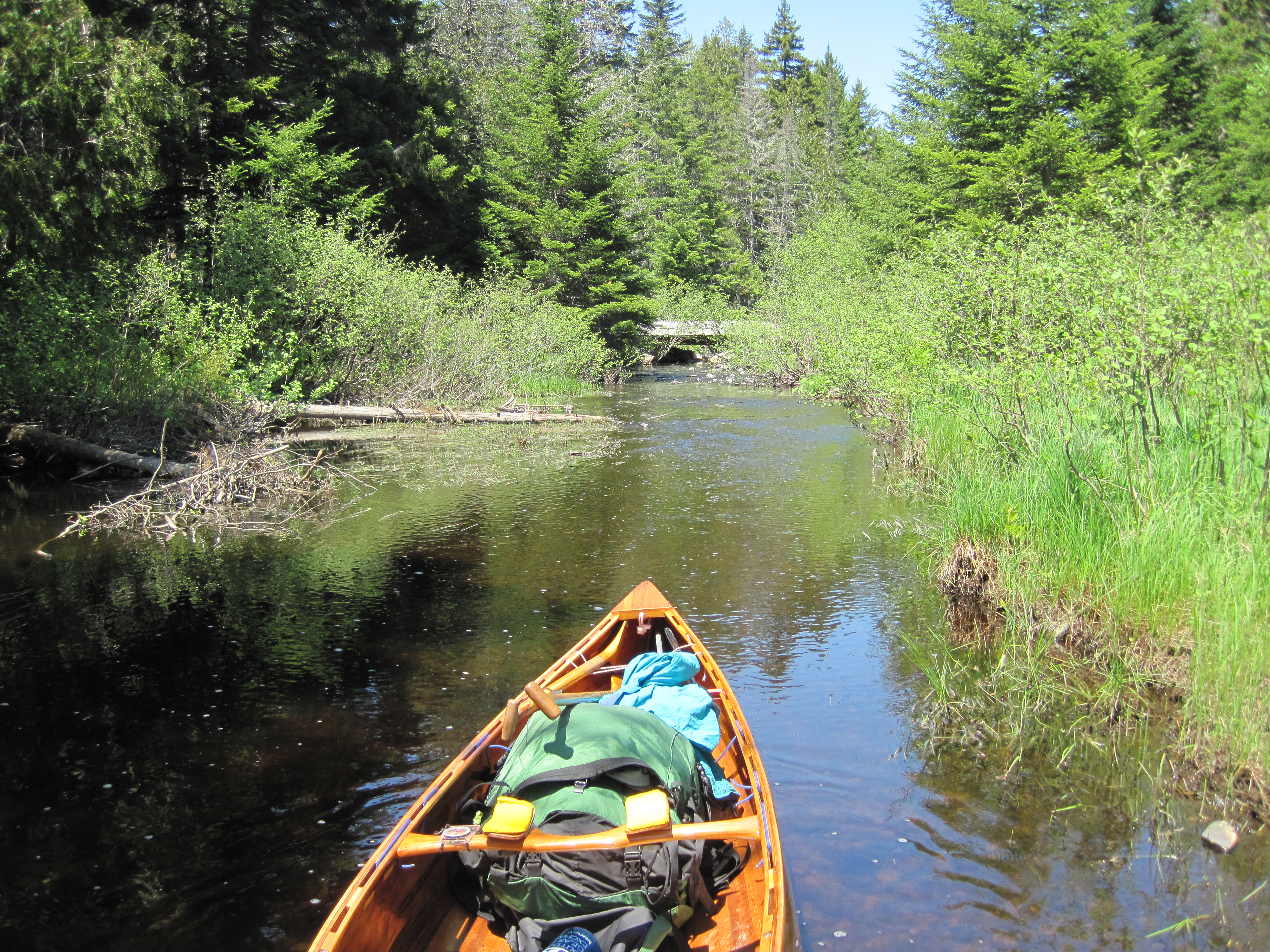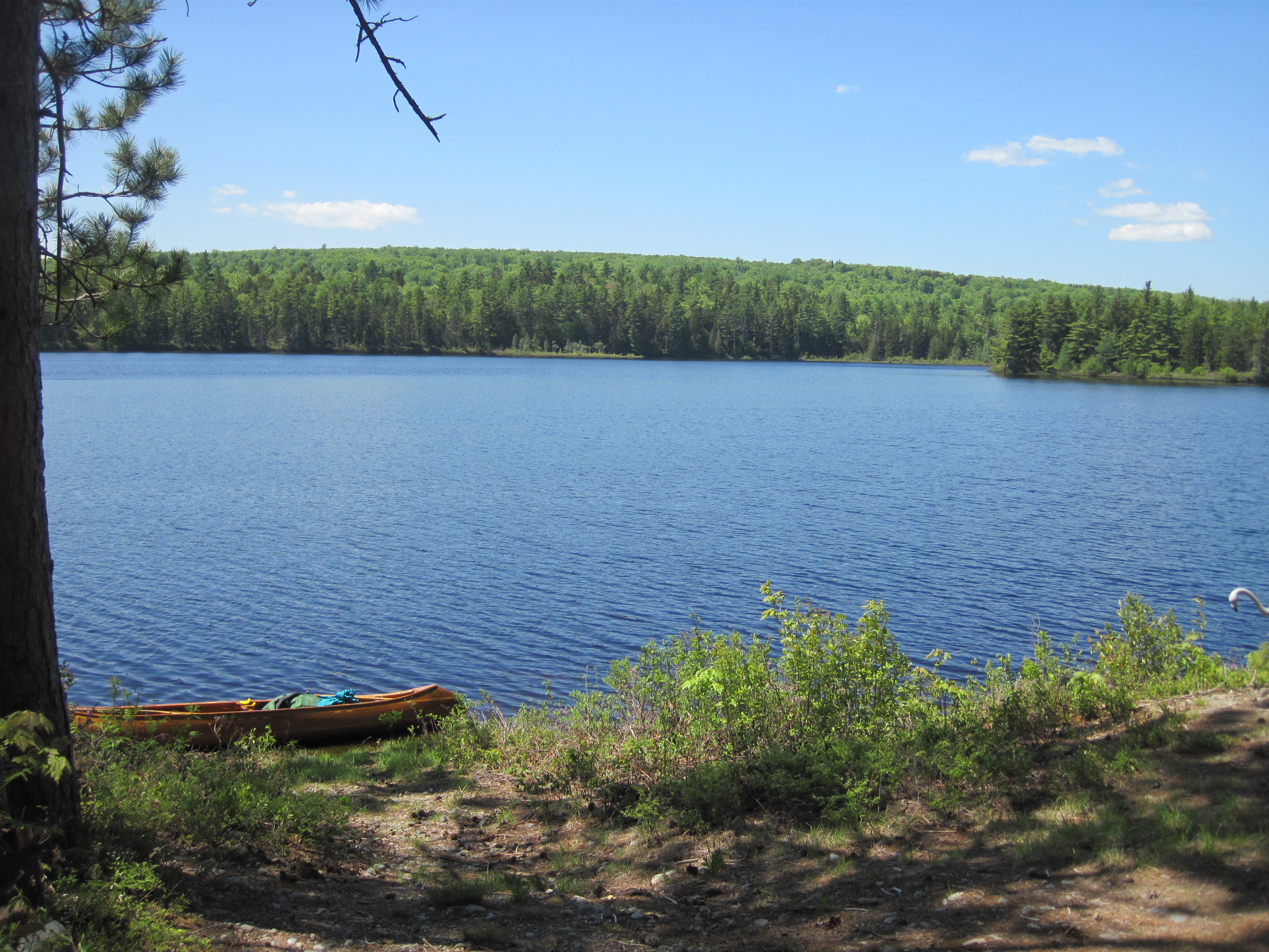 The walls were rocky, not vertical, but not far from it. At this point there was no realistic way back, so into the ravine I descended, lowering the canoe gently until it came to rest on something solid, and then climbing down after it, all with a 40 lb pack on my back. After a few such manoeuvres I was in the bottom of the valley, splashing across Stony Brook. Now I faced a similar wall, this time an ascent. I shoved the canoe upward, using vegetation as much as possible to cushion it, until I could rest the stern on something solid. Leaving it balanced there I now climbed up to where I could repeat the process. At each lift, my legs were hoisting my body weight plus pack. It was like doing single-leg squats with a backpack. Long before I was out of the valley, my legs were approaching muscle failure. It took substantial rests to disperse the lactic acid before I could move on again.