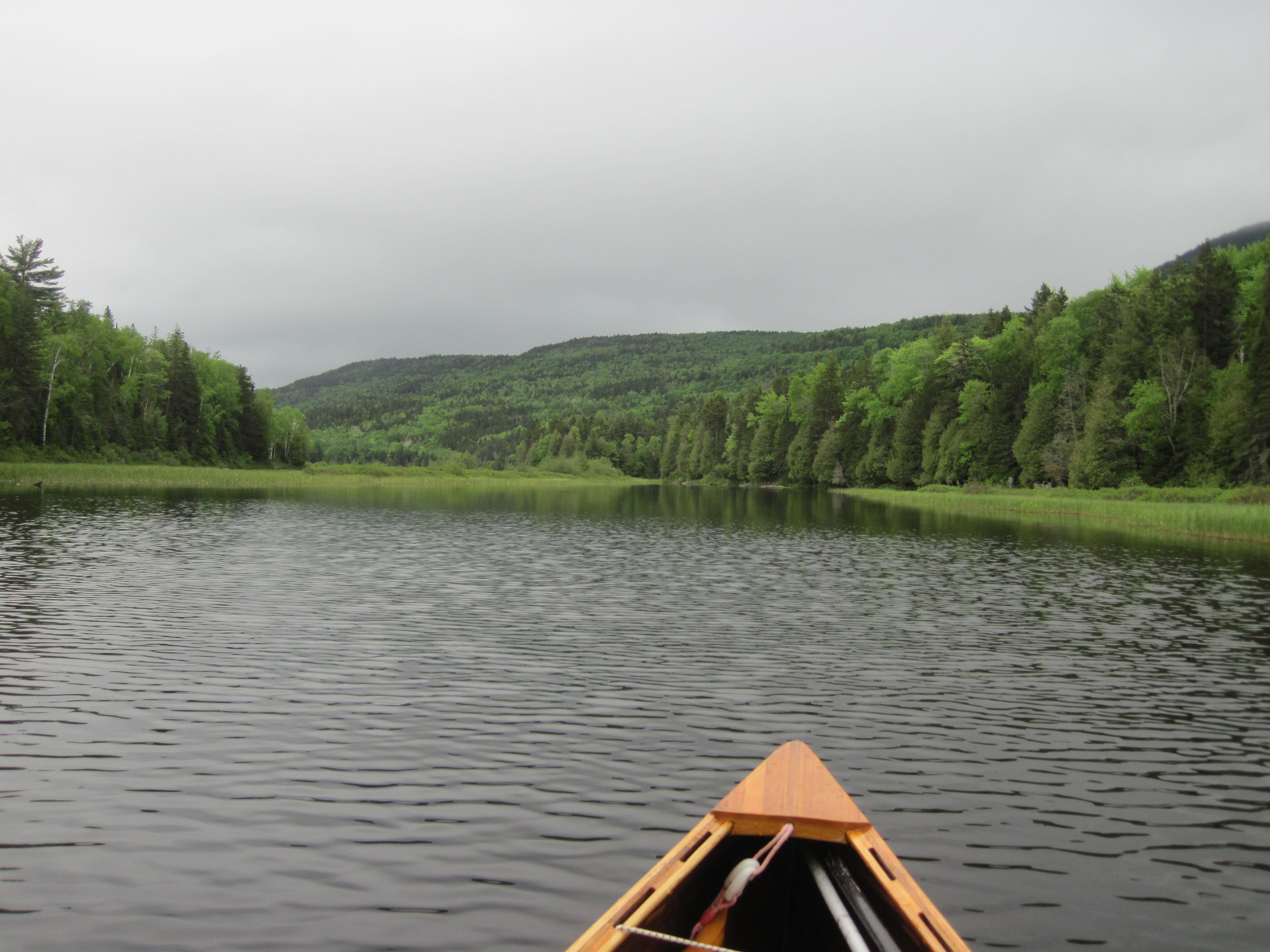 As I walked to the shower block at the far end of the campground I noticed two things: it was cold, uncomfortably cold, and the wind had shifted to the northeast, ensuring that I would have a headwind along the Chain of Ponds in both directions. I pulled out my thermal shirt once more, glad not to have mailed it home amid all the high temperatures of recent days. Breakfast was leisurely, and I set out on Natanis Pond at about 8:15 am. The sequence of ponds was familiar – Natanis, Long, Bag, Lower – but they looked different with cloud-decked mountains. Unusually for my experience of Maine lakes, these are relatively small and surrounded by quite high mountains.