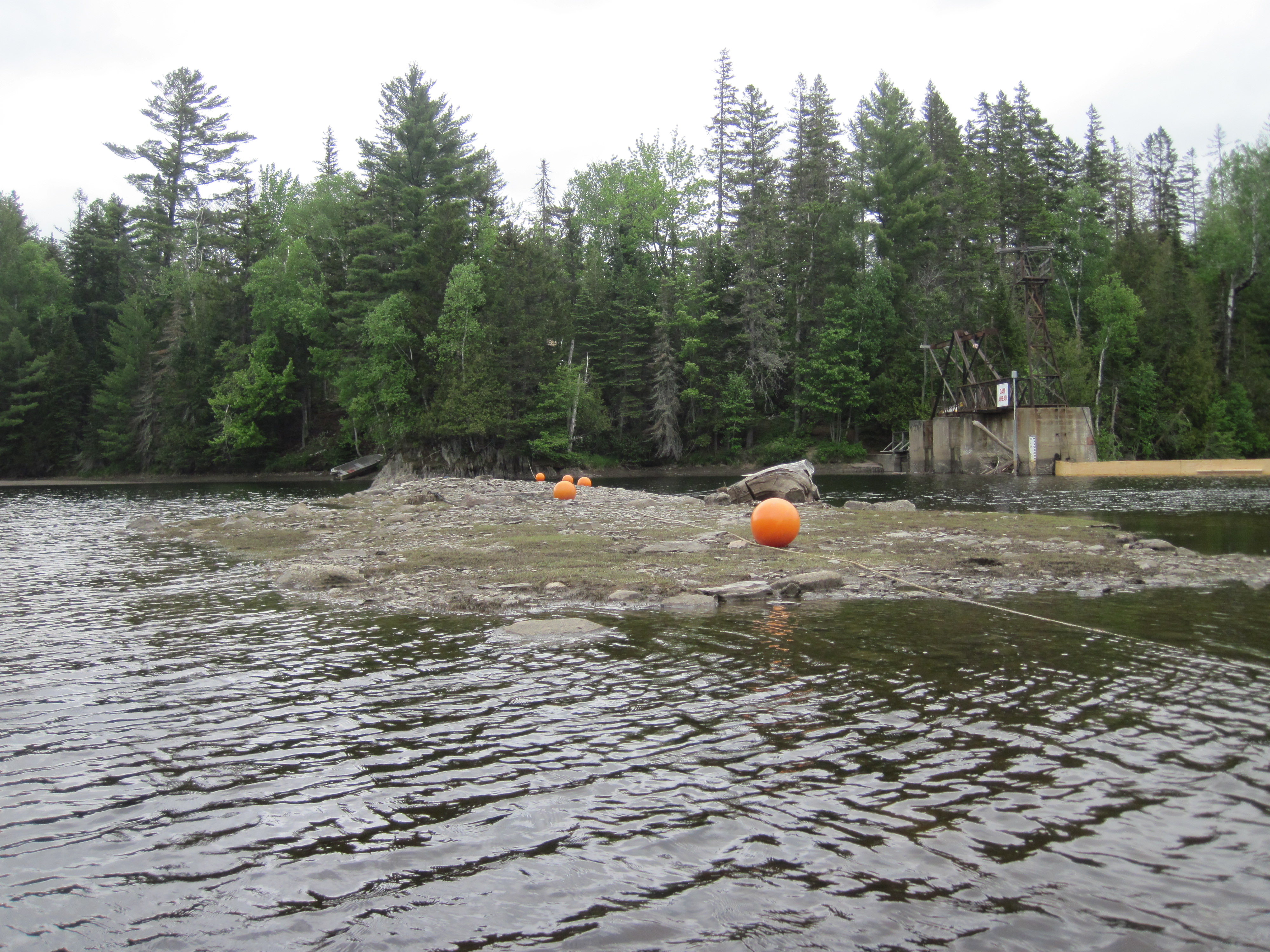 As the rapids subsided I set to some hard paddling to try to warm up. At Eustis Dam I was amused to see something I had missed yesterday: the boom that should be floating was draped over an island, so low was the water level.