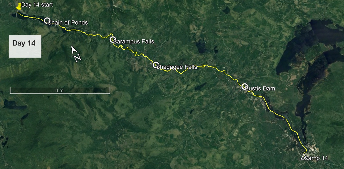 By the time I reached the dam at the east end of Lower Pond, I was warm from paddling, so shed my fleece. The fact that I put it back on again at lunchtime at Shadagee Falls says something of the conditions of my descent of the North Branch of the Dead River. The first two miles to Sarampus Falls I largely waded; despite the overnight rainfall there was too little water to float. After carrying past the falls and ledge below I strapped my long paddle into the canoe, confident that it would see no action above Eustis Dam. I kept my short paddle and poles at the ready.