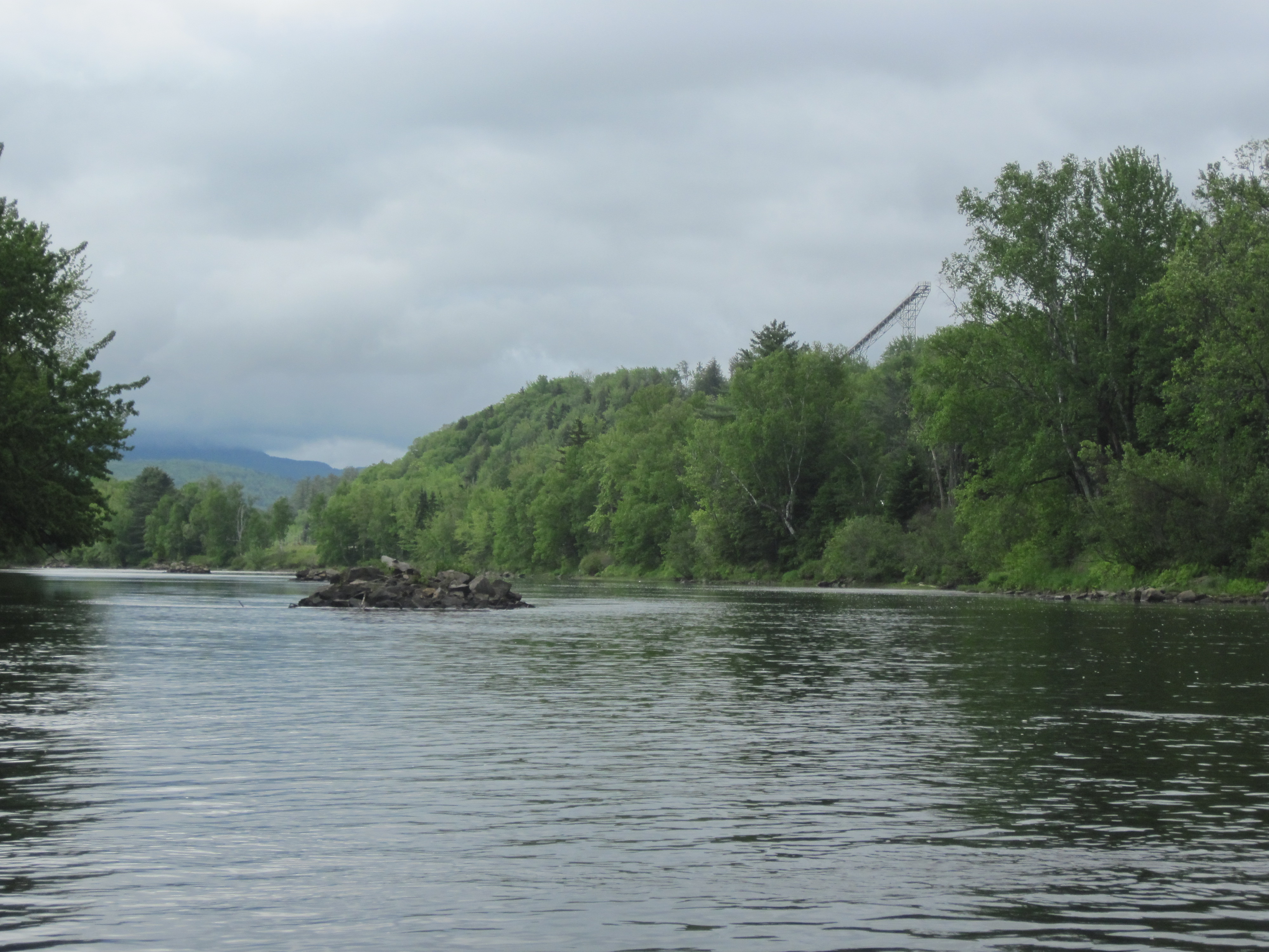 The early paddling benefitted from very little current, but I still reached the Milan Mill in about an hour and the 12th Street bridge in Berlin an hour after that. The river had been dotted with boom piers, anchor points from the log driving era which allowed separation of groups of logs. And the Nansen ski jump had adorned the horizon for a while. A group of three male mergansers had fluttered across the water surface about 200 - 300 yards ahead of me for much of this distance, even though I could not have been perceived as a threat at that range. Where they disappeared to eventually I never knew. Just below the bridge I found the take-out near the ball park, the start of a 3.3-mile carry around 5 dams in Berlin.