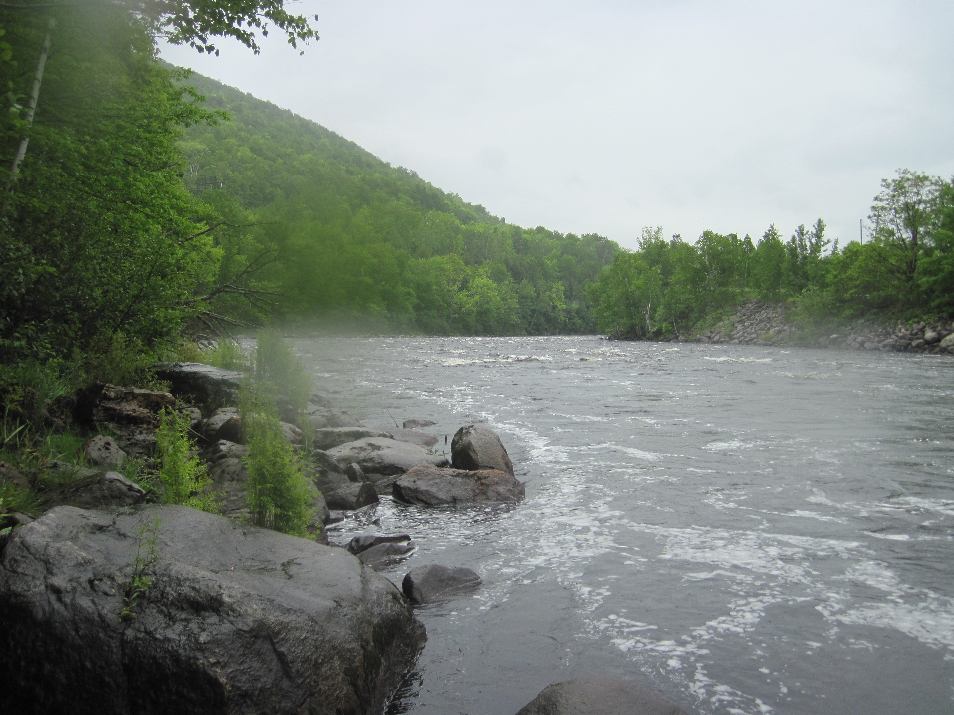 The next carry was well signed around the lower Gorham dam. The put-in, however, could do with some work. On a narrow peninsula between the Androscoggin and Peabody Rivers, a steep drop to my left led to rocks in the water which defied my attempts to stand on them, depositing me unceremoniously in the water to at least knee depth. The immediate rapids here had some haystack waves that would probably classify as class III, although their extent was very limited. This was enough, however, to persuade me to don my lifejacket.