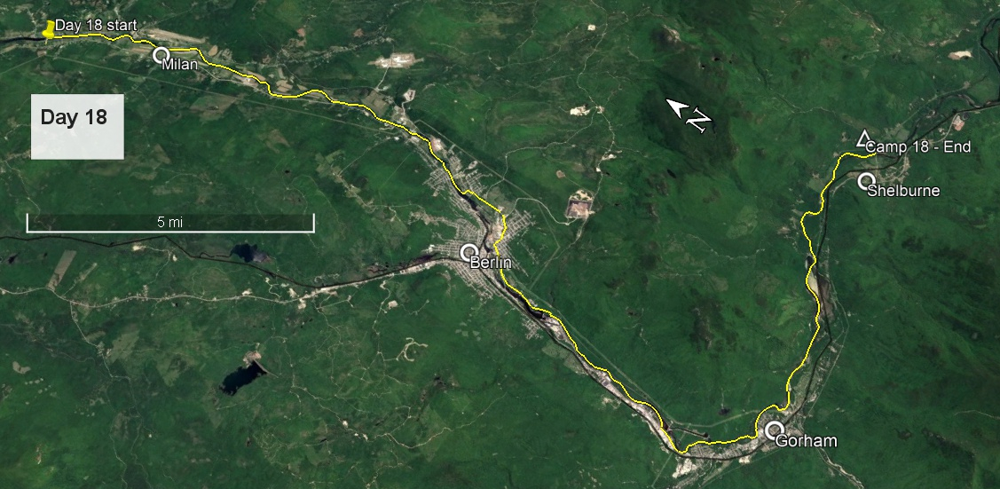 Ahead of me lay three more short portages, two around dams in Gorham and one around the dam in Shelburne. The Androscoggin has a long history of wood processing, the logs arriving by water and the mills being driven by water. Nowadays the dams are largely sources of hydro-electric power. I nosed downstream. Now the rapids started, upper class I and lower class II, in which route-finding was necessary but with plenty depth if I chose the right channels. What was needed was sustained focus, one of my strengths. With a few intervening flat spots, these rapids continued all the way to the first dam in Gorham.