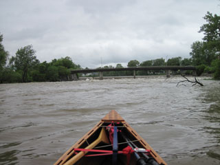 it is high, producing significant rapids below. I edge up on my right until a little above the take-out, and then dive into the rapids