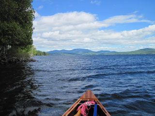 complete the carry and put in to Oquossoc Cove to paddle out on to Rangeley Lake. The strong wind propels me up the lake, and my only