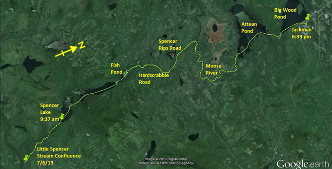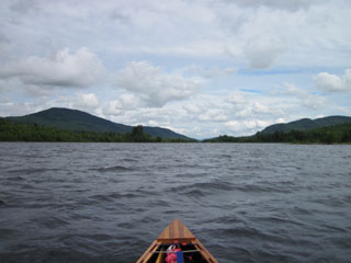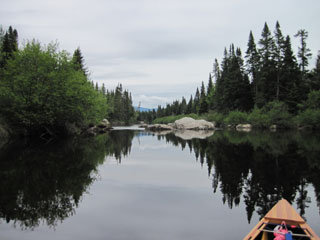 current for a few more miles dictates otherwise. The 5.5 or more miles of carry from here to Spencer Rips on the Moose River seem more