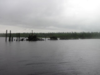as the stream emerges into Chamberlain Lake. The old trestle for the railway used in logging times emerges from the gloom, now a wreck