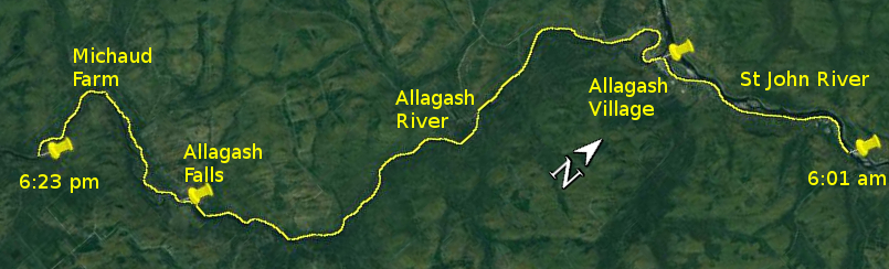 Another four or more hours of the same focussed progress brought me within sight of Allagash Falls. The rapids below the falls were larger than I