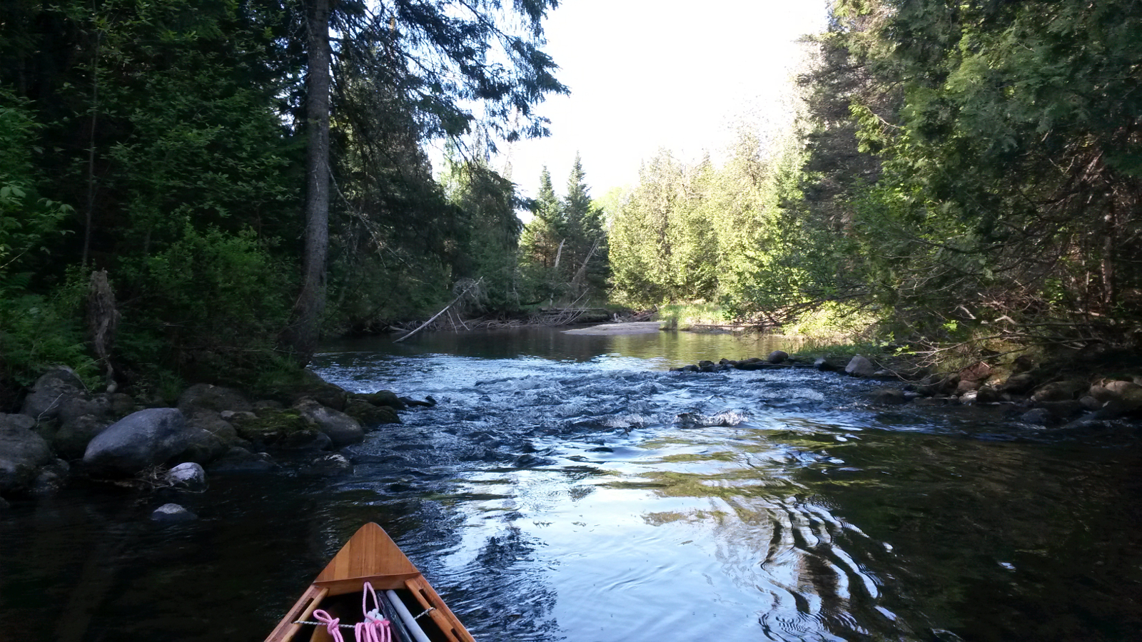 rapids were on the edge of what I considered runnable in a wooden canoe, yet I launched anyway, that being preferable to more carrying along the