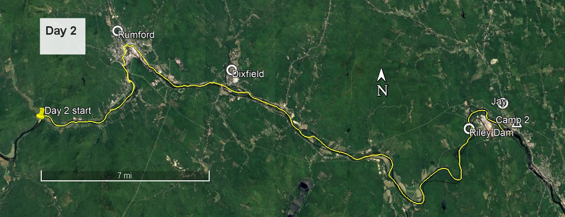 It seems that carrying a rather pretty canoe through a town in Maine is a good way to meet people. At least 6 people stopped to chat, some going out of their way to intercept me. The two miles of carry through Rumford therefore took about an hour, although this did also include some stops to admire and photograph the impressive falls. Having crossed the bridge over the Swift River, I turned left into a small park with access to this body of water, paddled it for a few yards and emerged back into the Androscoggin downstream of all the obstructions in Rumford.