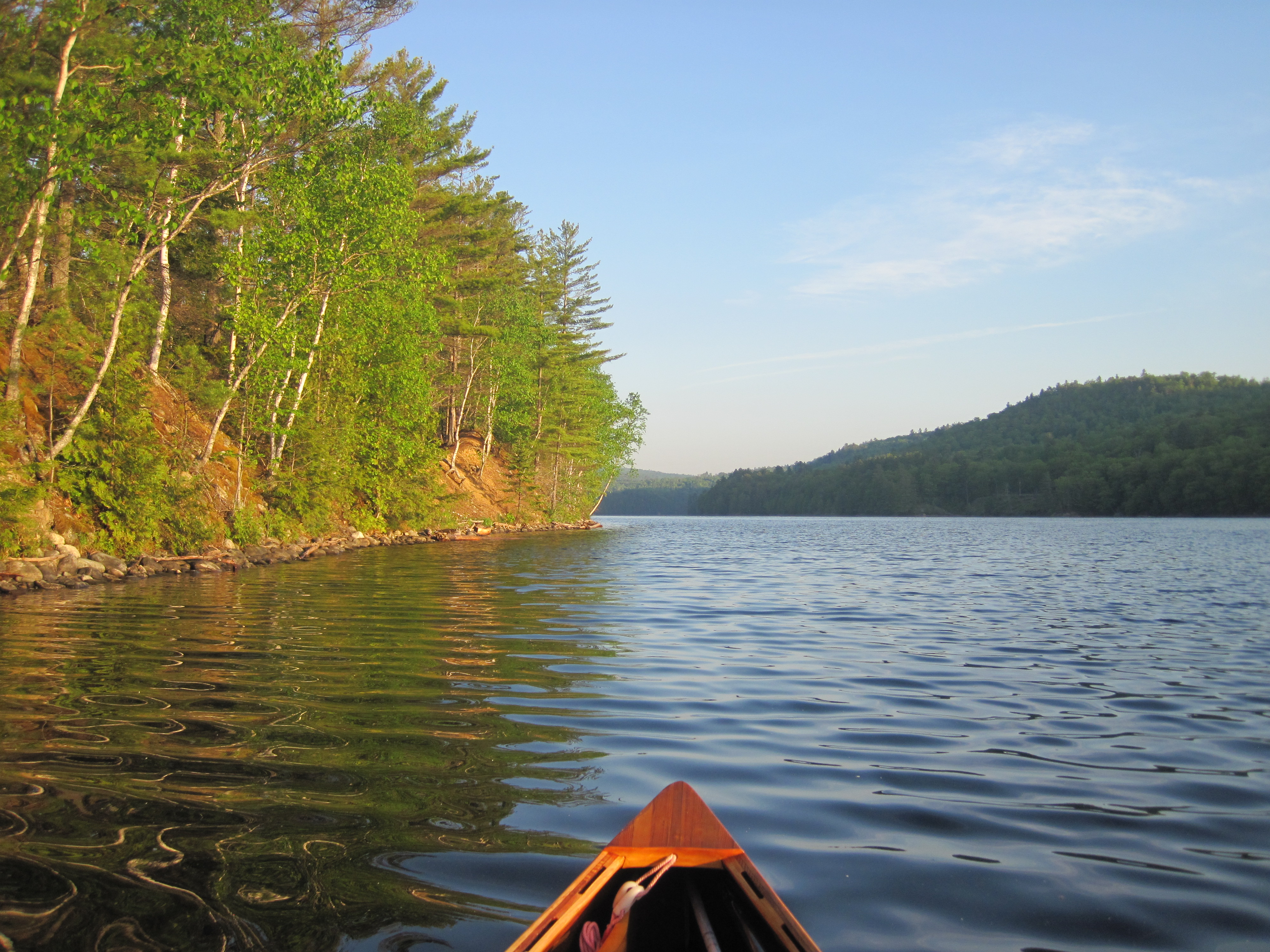 Today began and ended idyllically, but what came between was a different story. I was up early, planning to complete as much of the Great Carry as possible before the main heat of the day. This is the portage, nearly 11 miles, from Wyman Lake to Flagstaff Lake, punctuated by three small ponds: East, Middle & West Carry Ponds. The early paddling west on Wyman Lake was calm, wonderful for limbering up, the rising sun on my back. At the next bend, where the lake turns again to the north, and just south of the Carrying Place Stream, I found some pink flagging tape indicating the take-out. There was a clear path leading west to the road.
