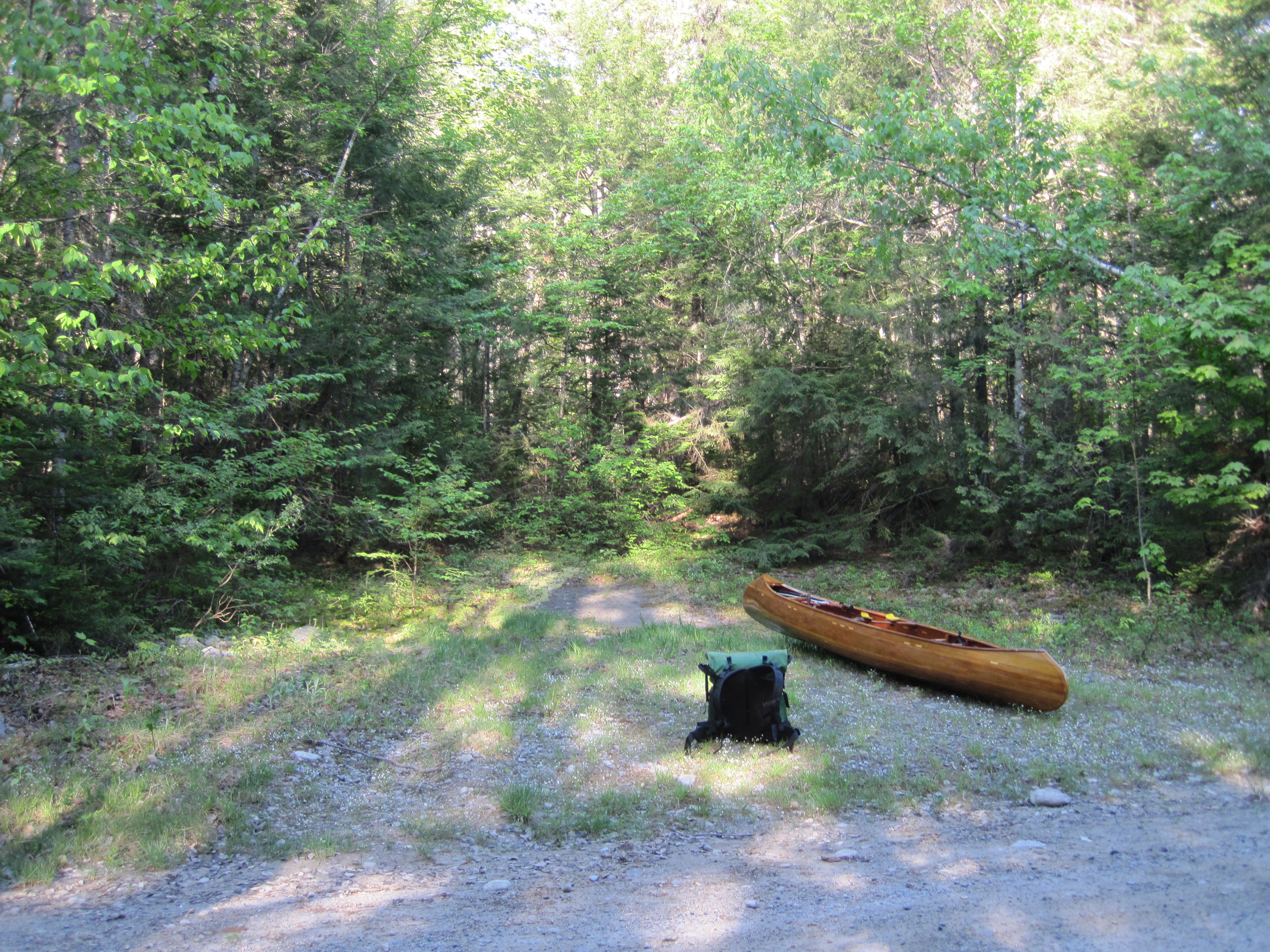 Little by little, though, I gained the more level ground at the top. Here I found more old skidder trails and followed these northwest. This, together with more bushwhacking through young growth, suddenly brought me to where I could see an opening. Closer inspection revealed that it was a road, so I made my way there, emerging just south of where the trail crosses that road. From where I had dropped my waypoint when hopelessly lost, I had travelled about a mile to the northwest, mostly on steep, rugged, densely vegetated terrain, and involving a certain amount of rock-climbing. The new activity that I had discovered – canoe rock-climbing – is not one that I recommend. My legs were dead. The distance I should have travelled from the previous road was 0.8 mile, maybe 20 minutes uphill. Instead, this had taken me 2.5 hours of extremely hard work. Now I faced the remainder of the Great Carry.