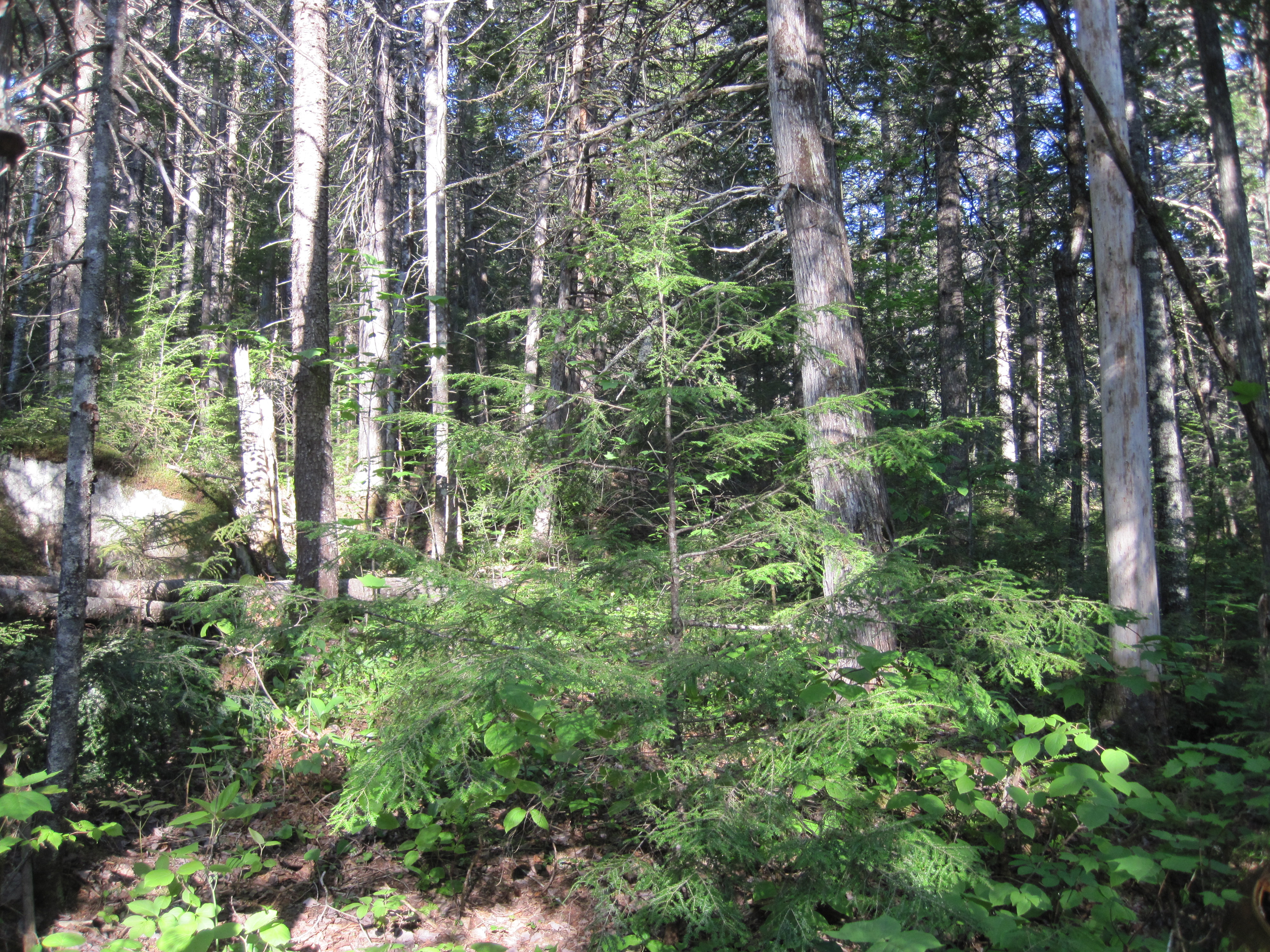 This trail became ever less distinct. The brain is enormously adept at seeing patterns, even where none exists. Maybe I was identifying a clear path even though there was none. The trail also became steep as I climbed out the south side of the Stony Brook valley, a tributary of the Carrying Place Stream. I knew that Arnold's men had grumbled at the amount of ascent, and was beginning to empathise. Eventually, even my brain recognised that I was not on any kind of recognisable trail. The young growth crowded in on me, leaving insufficient room to push the canoe through. Piles of rocks swallowed my shins as my feet descended into abysses. This was turning into another instance of my Mud Pond Carry debacle (see NFCT Through-Paddle, 2018, Day 5). I could not believe that I had been so stupid as to push this far before thinking about turning back. Now the route to retrace my steps was as uninviting as continuing forwards.