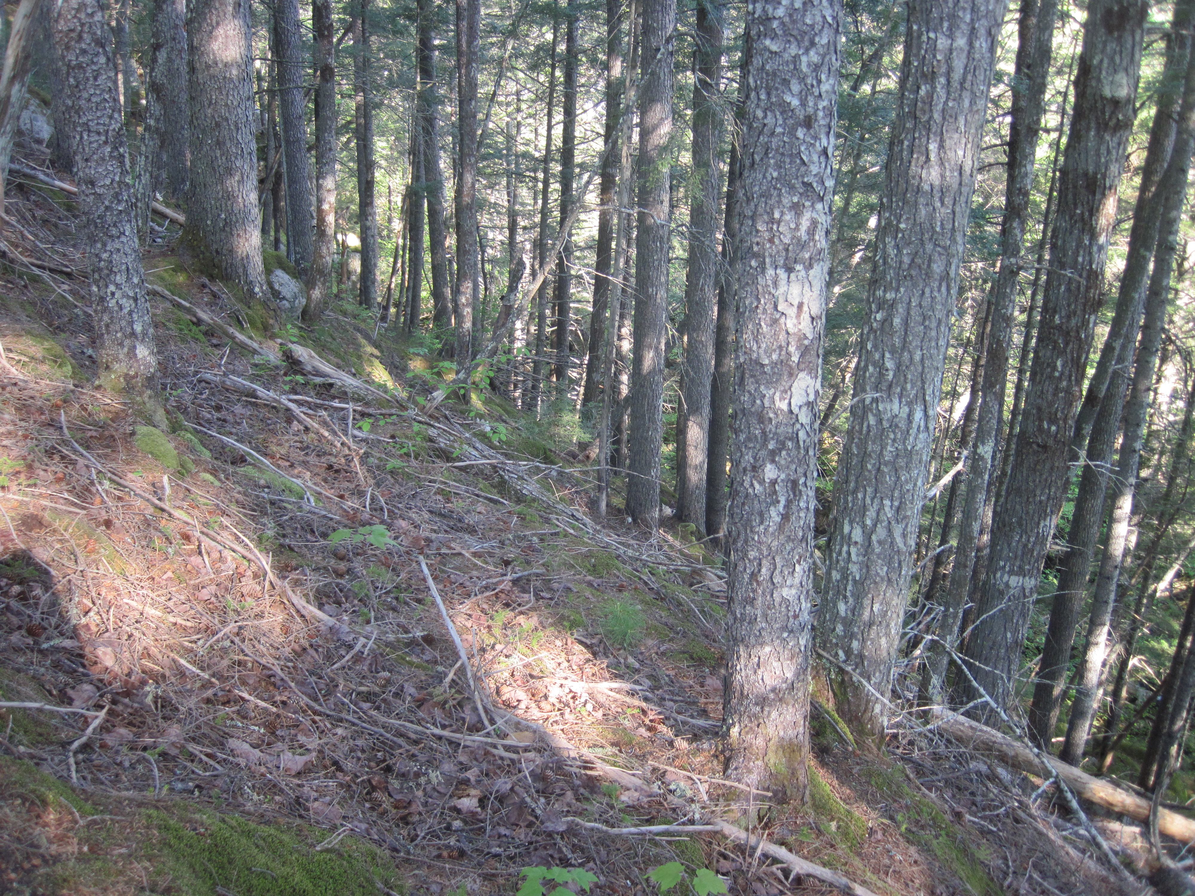 In a rational moment I got out my phone and fired up Gaia GPS. I had laid down a route along the approximate trail, and the satellite locator could tell me where I was relative to that route. It was a shock to see that I was about a quarter of a mile south of the trail and on totally the wrong side of Stony Brook. I should have proceeded farther along the road before turning off. Looking back at the waypoint I dropped when leaving the road, I had climbed over 200 feet in less than a quarter of a mile. I toyed with the idea of aiming around the head of the Stony Brook valley, but that would be an even longer bushwhack. My chosen solution was to head north, as closely as possible. This was the shortest route to the trail. Once more I rammed the canoe between trees. Sometimes, when there was sufficient soft vegetation, I set the canoe down and dragged it between trees, anything to be able to make progress. Here and there I found clear paths, maybe the remnants of old skidder trails, and if they led to the north or northwest I followed them until they petered out. But my northerly course was leading me into the valley, and this valley turned out to be more of a ravine.