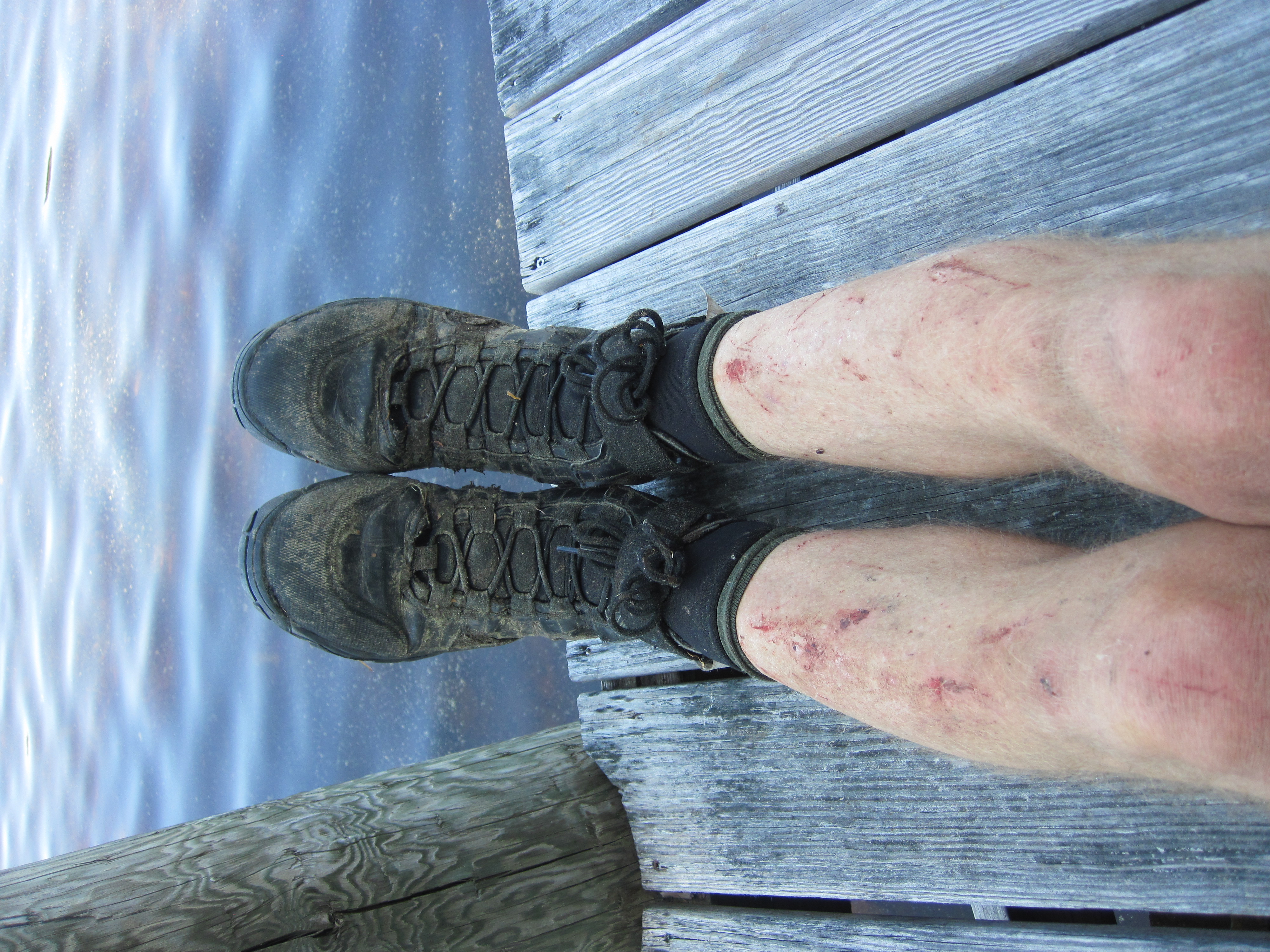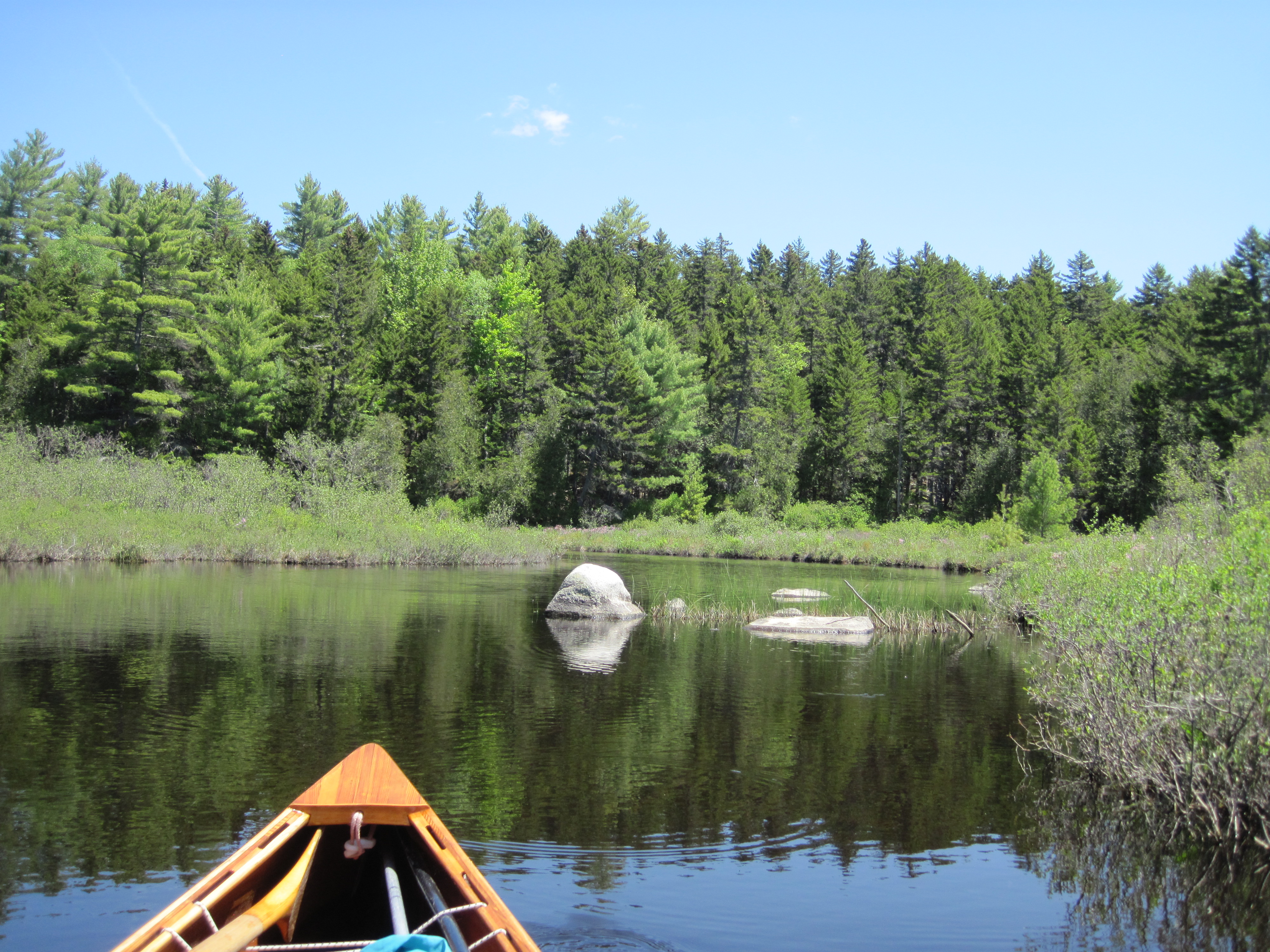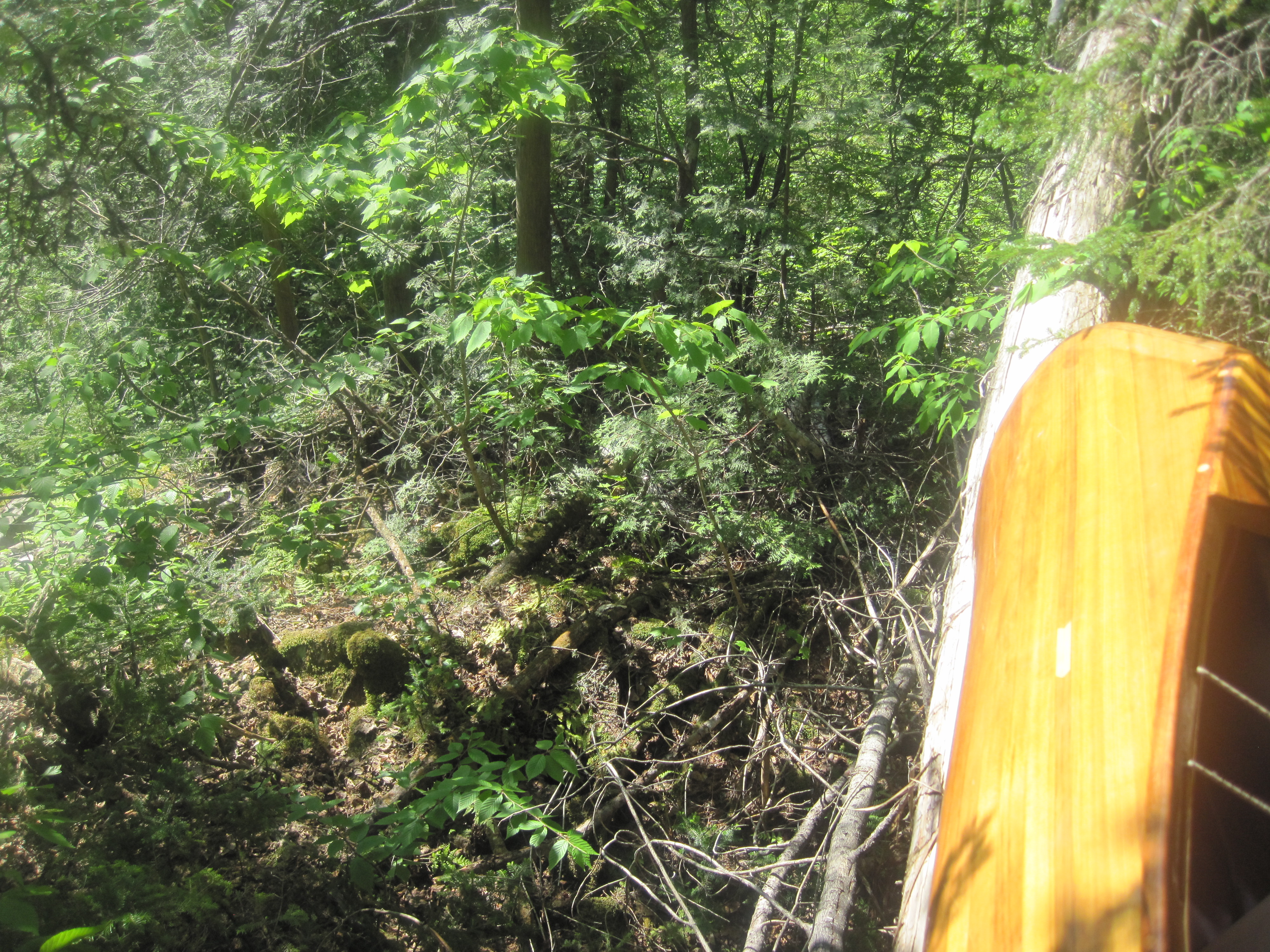 The walls were rocky, not vertical, but not far from it. At this point there was no realistic way back, so into the ravine I descended, lowering the canoe gently until it came to rest on something solid, and then climbing down after it, all with a 40 lb pack on my back. After a few such manoeuvres I was in the bottom of the valley, splashing across Stony Brook. Now I faced a similar wall, this time an ascent. I shoved the canoe upward, using vegetation as much as possible to cushion it, until I could rest the stern on something solid. Leaving it balanced there I now climbed up to where I could repeat the process. At each lift, my legs were hoisting my body weight plus pack. It was like doing single-leg squats with a backpack. Long before I was out of the valley, my legs were approaching muscle failure. It took substantial rests to disperse the lactic acid before I could move on again.