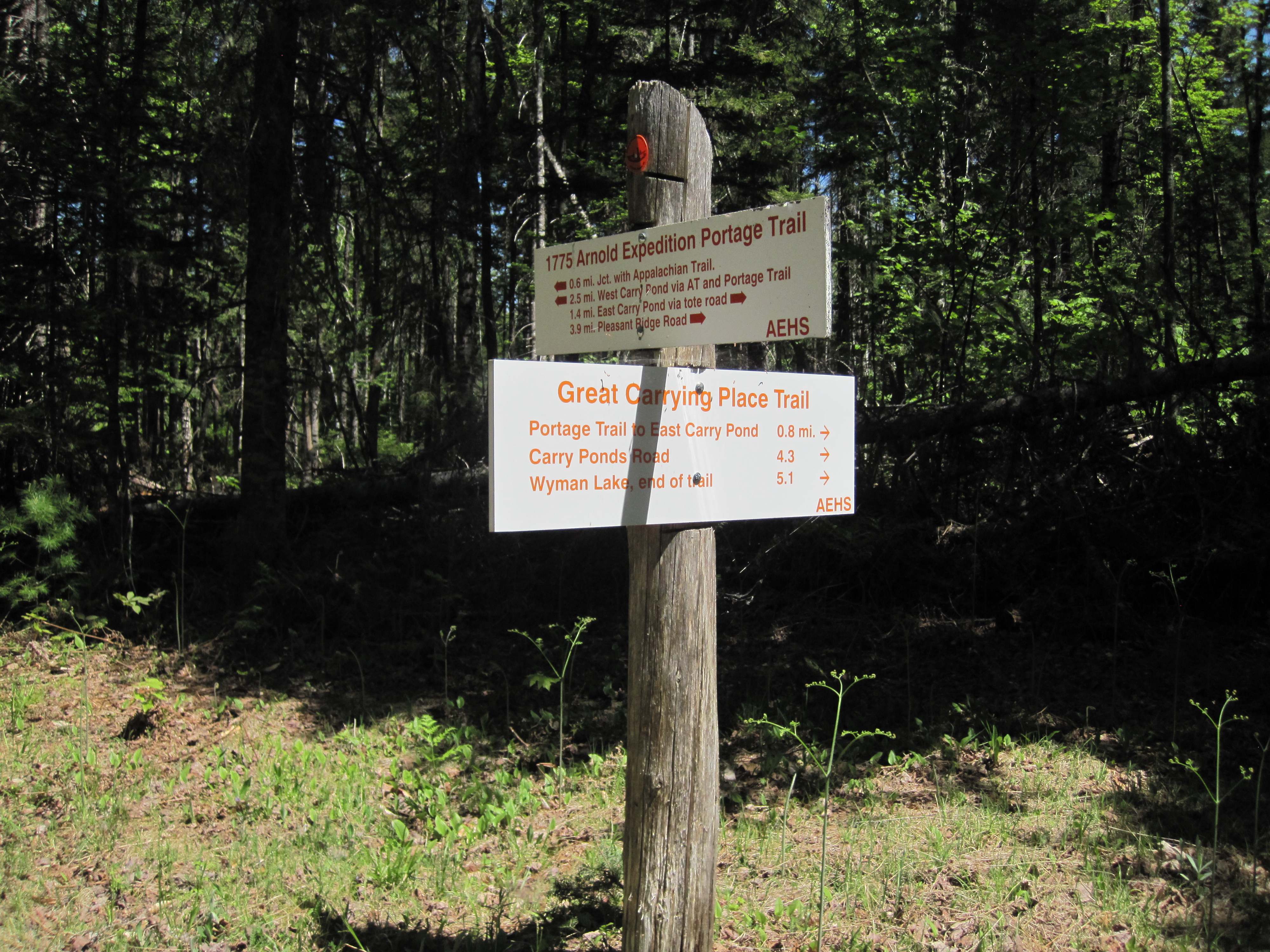 I launched into Middle Carry Pond, another delightful body of water, still paddling with straight legs. Here I crossed to the west for about half a mile and then proceeded up the lovely but misnamed Sandy Stream inlet for at least another half mile. With the bridge in sight I ran out of water, so started to carry mid-stream. At the bridge I joined the Appalachian Trail, and followed this southwest and west for 1.8 miles. The trail was clearly marked, although quite uneven under foot. Just occasionally my legs began to swing a little more, rather than just trudge.