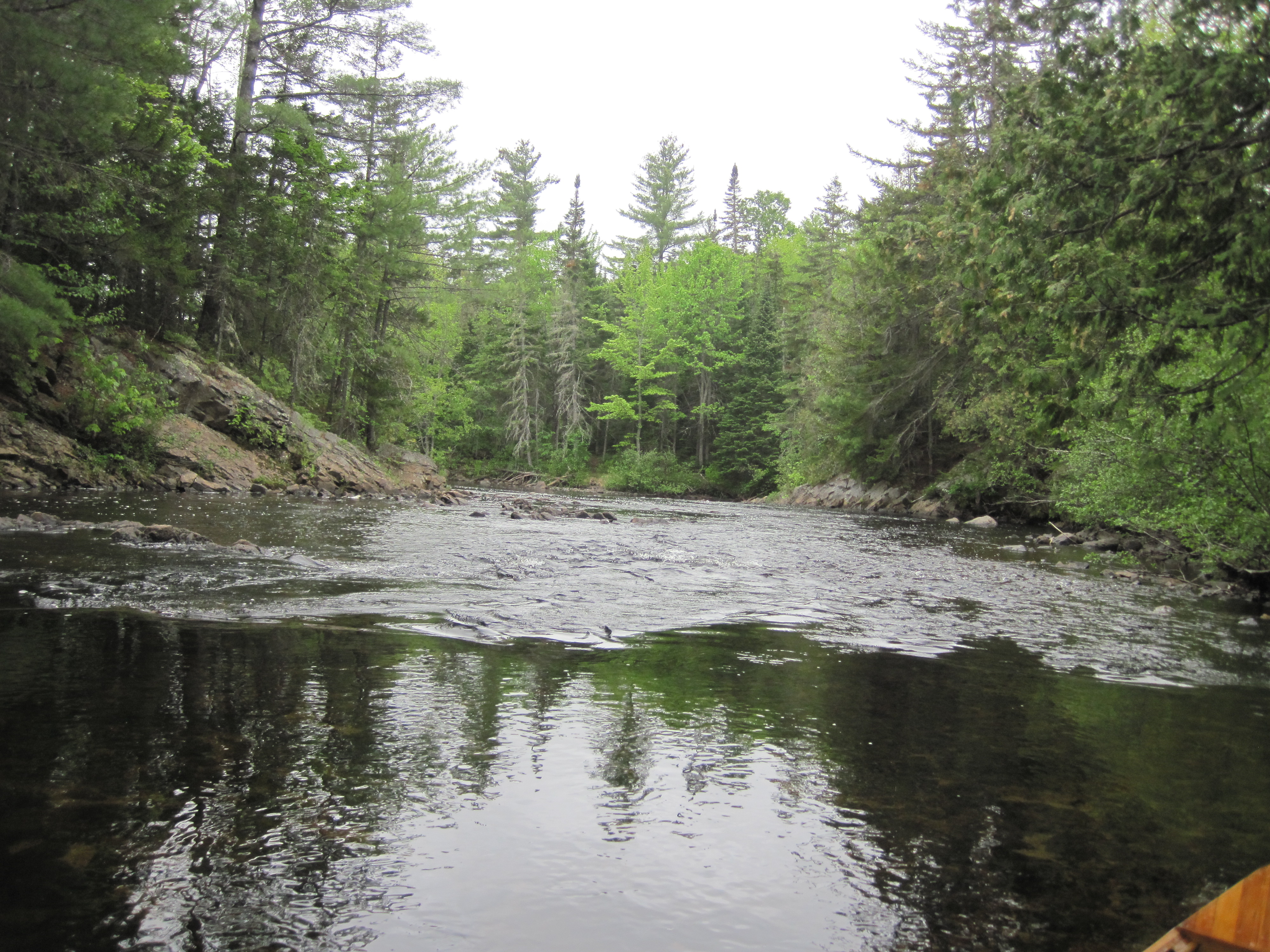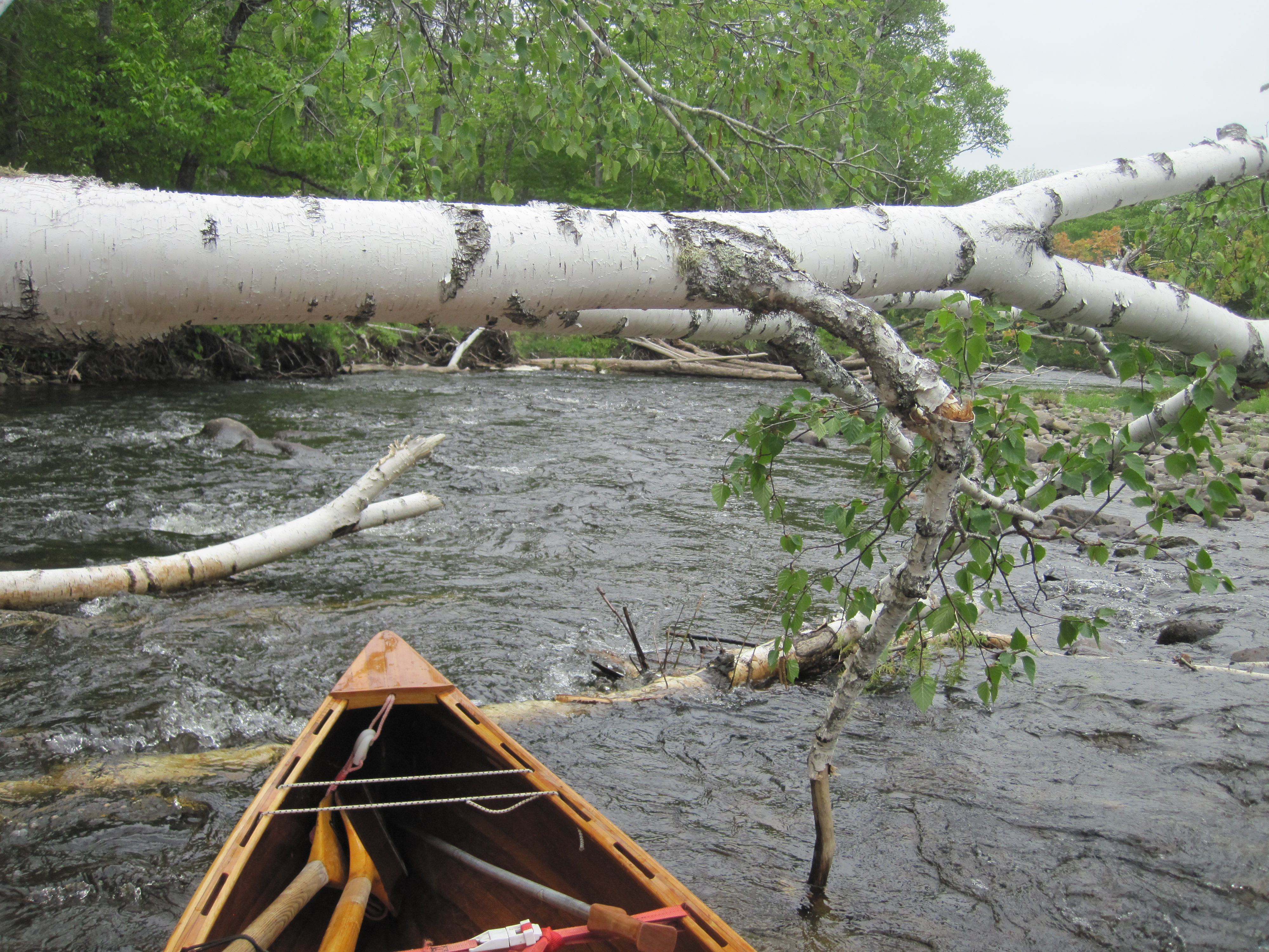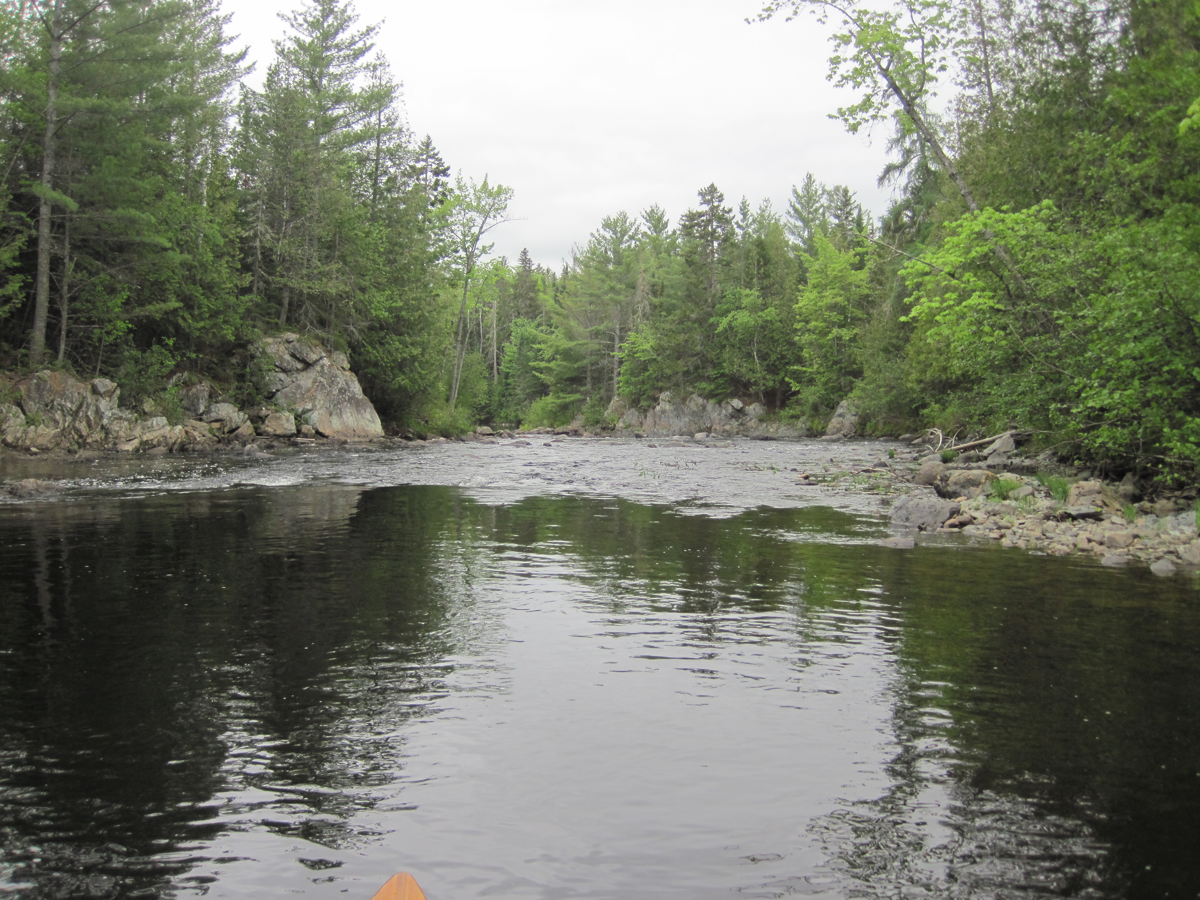 At the class II rapids lower down I succeeded in poling part way, but was soon wading, controlling the canoe from the stern deck thwart. The depth of water here varied from ankle-deep to thigh-deep, and some holes swallowed me to waist-deep, while also barking my shins some more. I tried, where possible, to let the canoe take the route that the water chose, but this was not always optimal. A portage was signed for the downstream paddler for the last steep drop of the upper section of rapids. No such portage existed, however, for the larger lower section, and this had several steep drops where the water flowed powerfully through chutes between rocks. At one of these, the canoe made it through just fine, but I was left clinging to the rock and to the canoe's stern deck thwart. Ahead of me was truly deep water, probably too deep to stand; I had nowhere to step. My only solution was to hurl myself on to the rear deck, but this immersed me up to the waist. I was now effectively swimming the canoe, but succeeded in assuming some semblance of control.