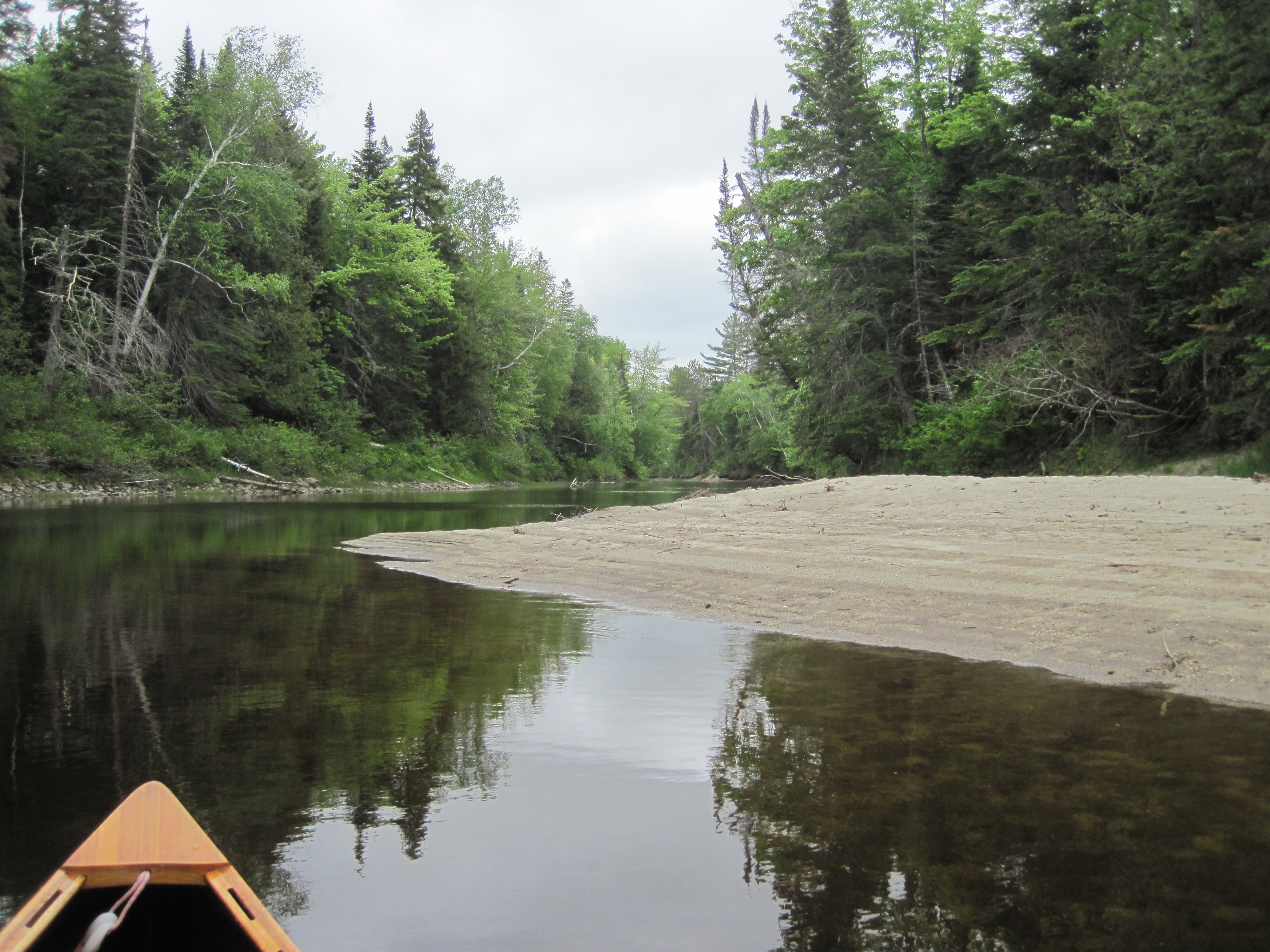 Some of the riffles had channels which were deep enough to run, but I used my poles to snub, digging in to the river bed ahead of me to control speed, thereby minimising damage when rocks inevitably rose up into my path. My rate of progress was not much faster than heading upstream, and I began to regret the late start. Where conditions allowed, I paddled hard, but these were few and far between. The portage at Shadagee Falls was an opportunity for lunch and also to put my fleece back on. The day was truly cold, and I had been wading extensively. The character of the river continually changed, from rocky with boulders to rocky with ledge to sandy and shallow to muddy and alder-lined. The one thing that didn't change was the low level of water. And sand and mud did not preclude the presence of lurking rocks.