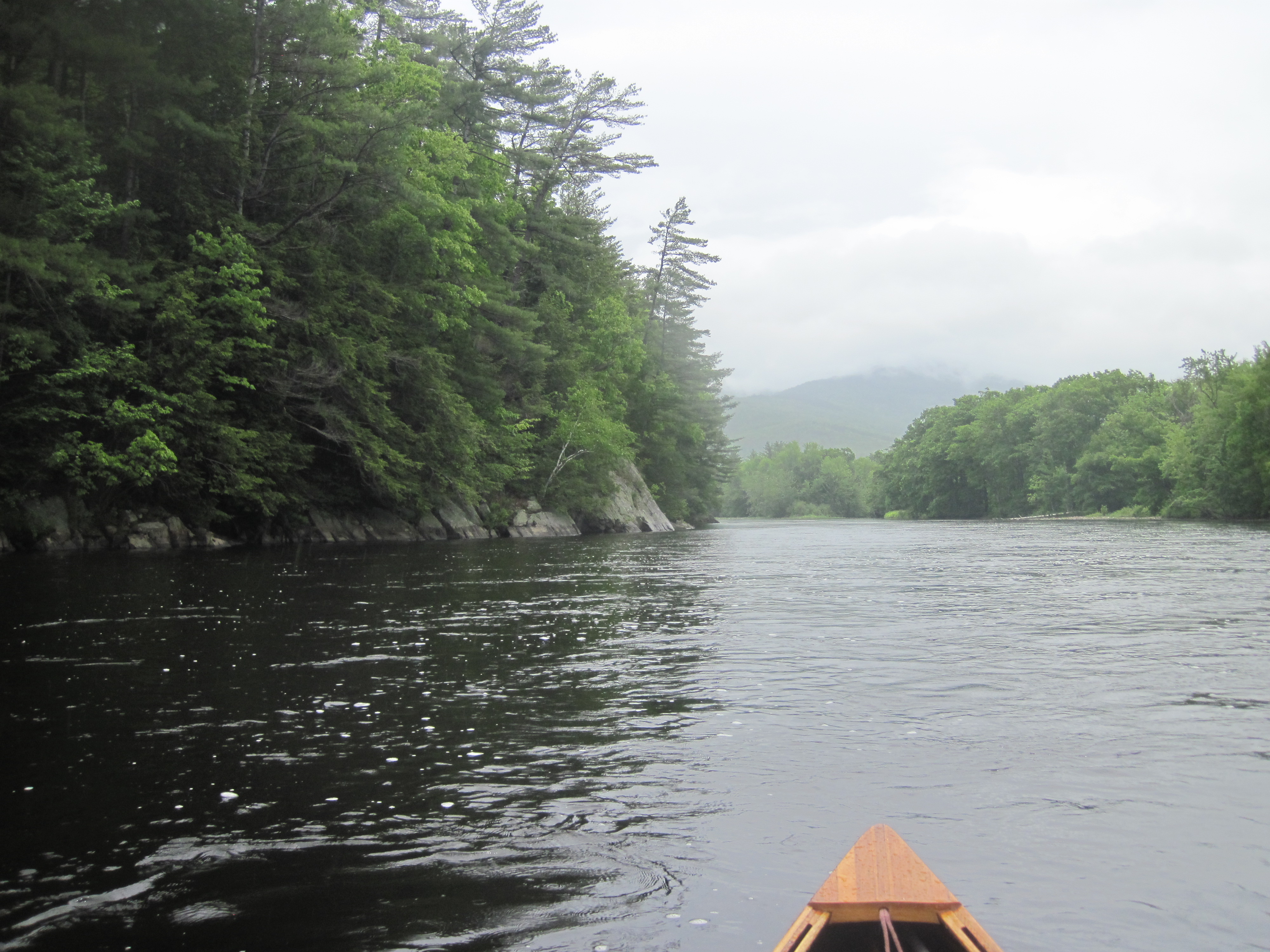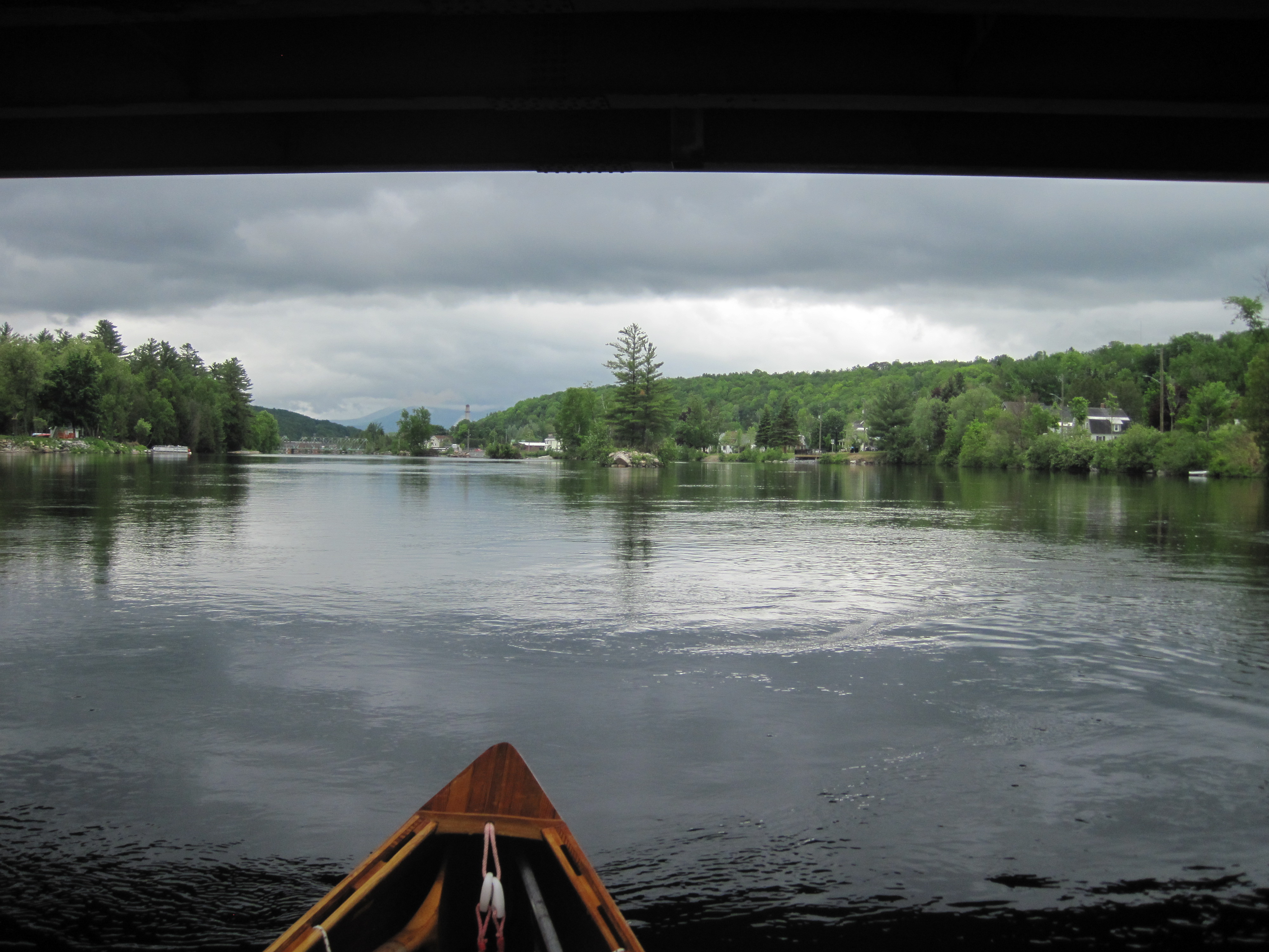 Ahead of me lay three more short portages, two around dams in Gorham and one around the dam in Shelburne. The Androscoggin has a long history of wood processing, the logs arriving by water and the mills being driven by water. Nowadays the dams are largely sources of hydro-electric power. I nosed downstream. Now the rapids started, upper class I and lower class II, in which route-finding was necessary but with plenty depth if I chose the right channels. What was needed was sustained focus, one of my strengths. With a few intervening flat spots, these rapids continued all the way to the first dam in Gorham.