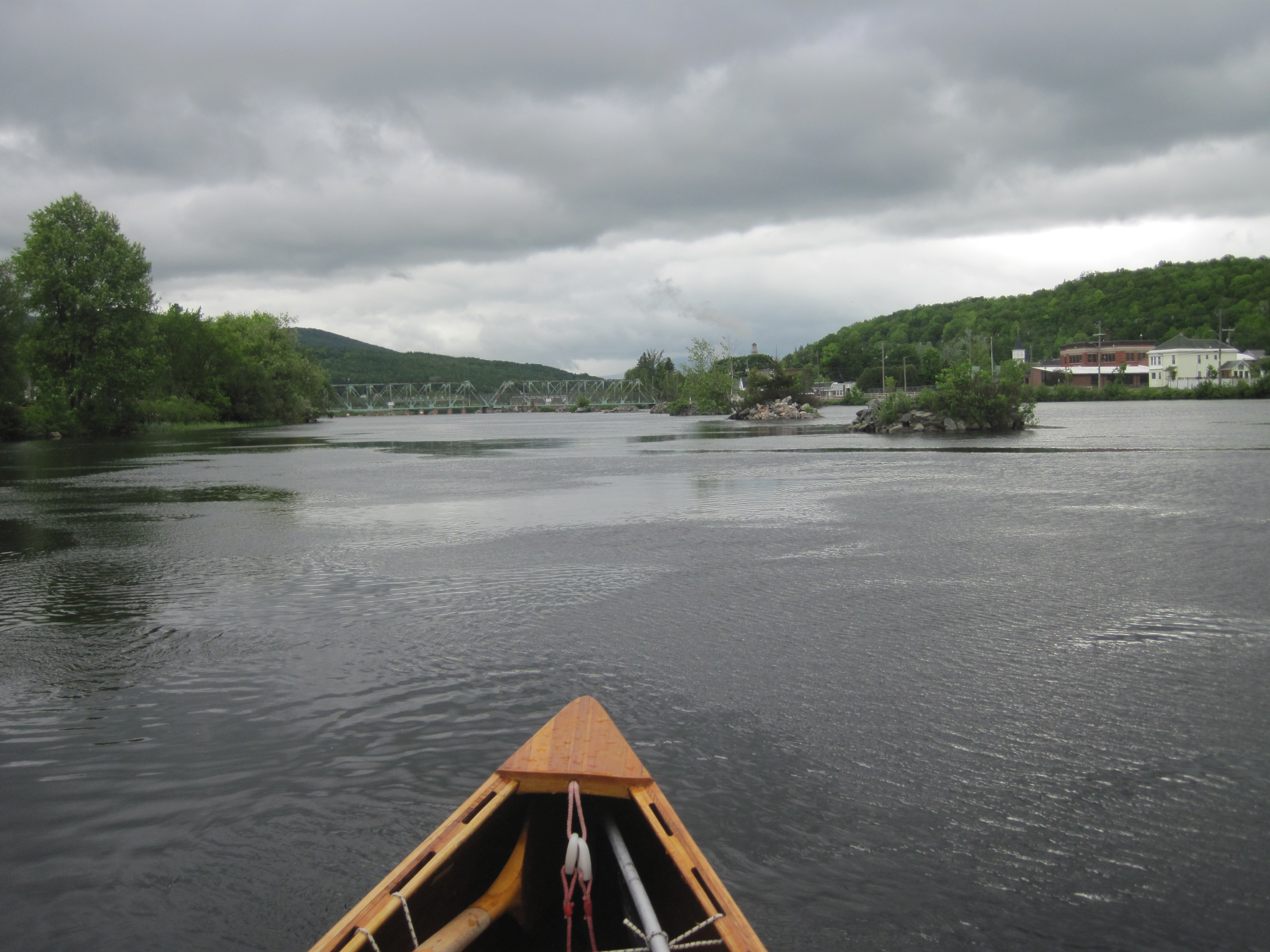 The rapids subsided as the river spread out into the Reflection Pond, a large flooded plain which serves well for flood control. Towards the far end, just above the Shelburne dam I found Ray again, and he guided me on a route through the woods, not yet a portage path, but he has ambitions to make it so. The put-in, just across the road, was straightforward, leaving me just 3.2 miles to reach the Meadow Road bridge. This was splendid paddling, fast current and gentle rapids threading between islands, and the remaining distance took me only about half an hour without paddling hard at all.