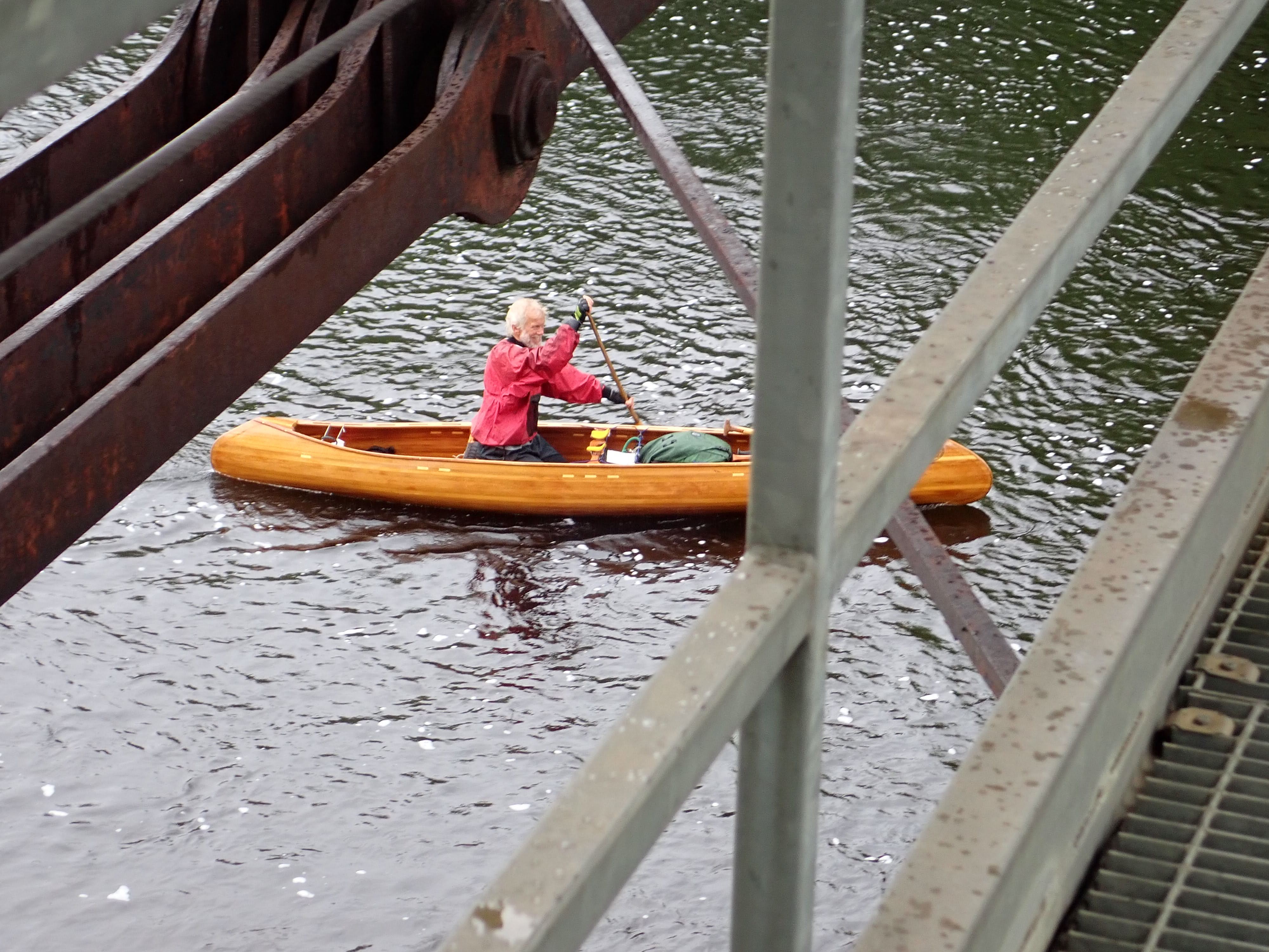 Ray and Hildy were there to welcome me and to take a few pictures, but no tea this time. Hildy had to leave for a musical gathering, but Ray continued to meet me at the remaining carries. This first dam was by-passed on the road, leading to a rocky put-in at an old ford. Here I fashioned a way into the deepest water, and then sped under the old rail bridge where Ray was wielding the camera. I was now confident of the depth of water, so not trying to control my speed in the rapids. Consequently I was making swift progress.