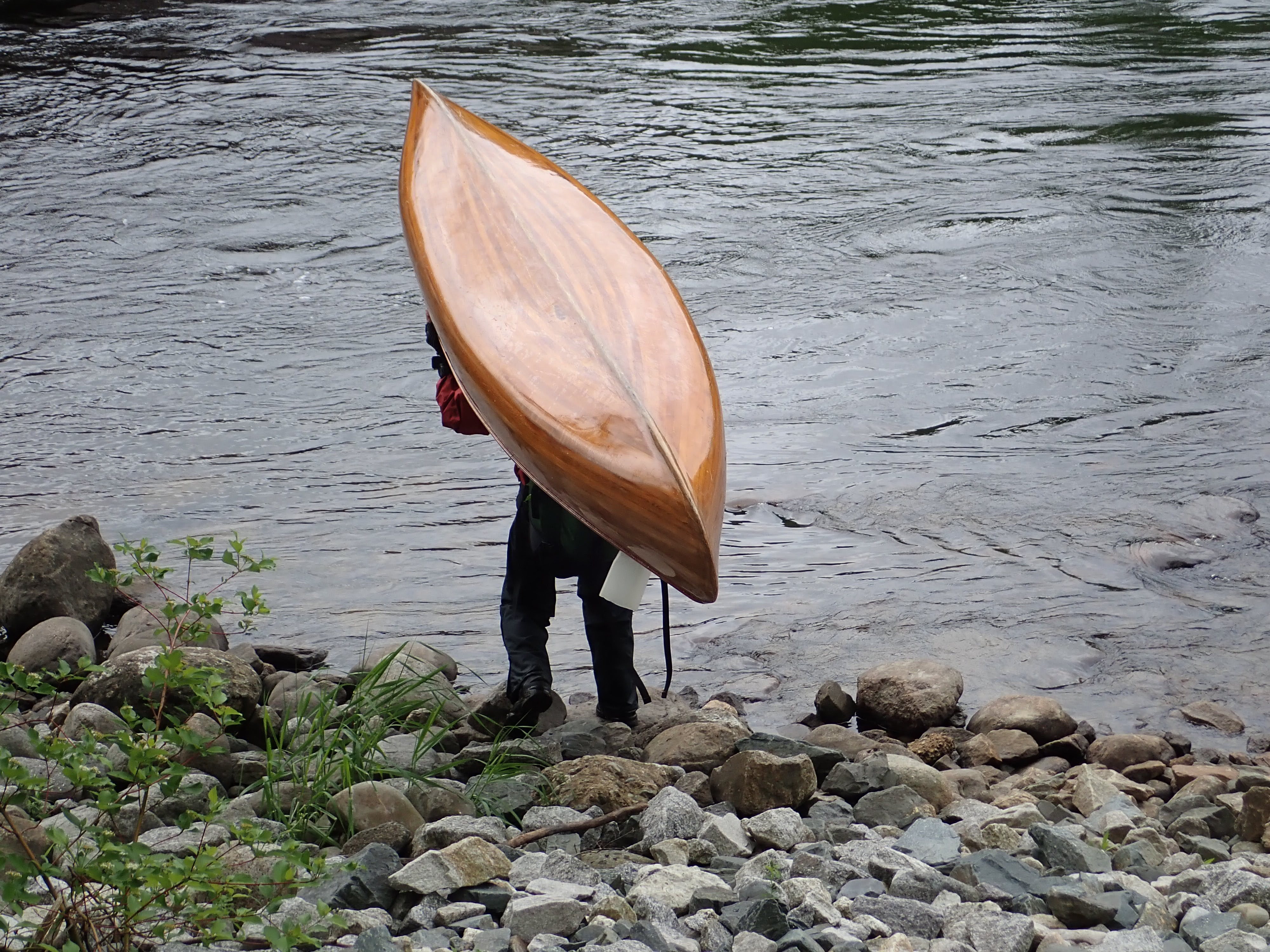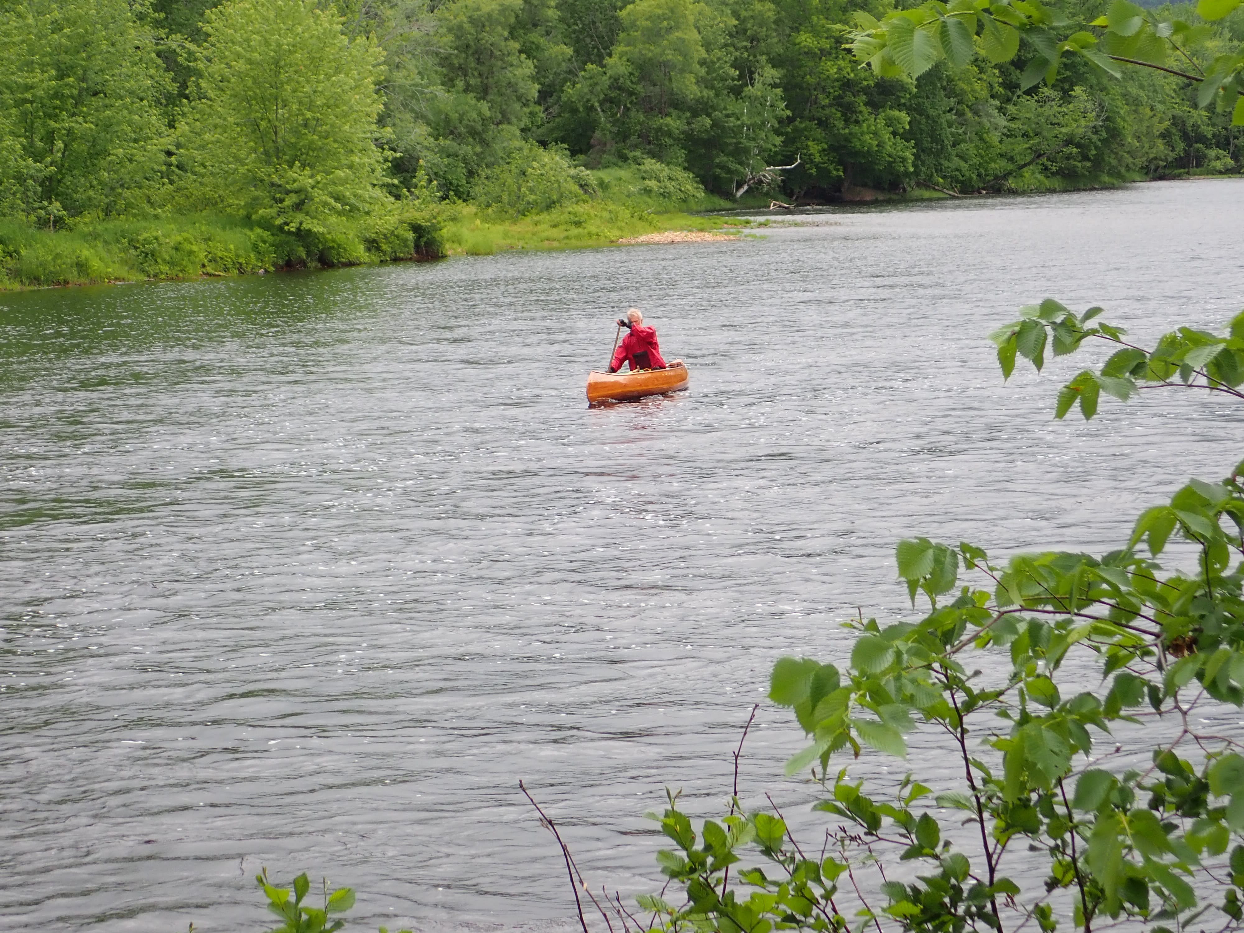 My pack was light and the carrying was easy on roads. As I took a break, a truck driver pulled up. He had doubled back to offer me a ride. I was grateful for the offer, but was about to leave the streets for a rail trail, so declined. Around a few bends I found the old railway station building, and leading south from this was the old railway bed, now a multi-use trail. The surface made for easy walking. At one point I passed a bunch of discarded small backpacks, which was suspicious, so I made a mental note to call the Berlin City Police to report these. Nearing the end of the carry, maybe after an hour or so, I tried to close the distance between myself and the water, but merely succeeded in reaching where I had been originally aiming for under the power lines but by a rougher route. Now I was at the top of a 30-foot bank or higher, leading down to a flat plain before the final small drop to the river. Carrying down such a steep slope while top heavy seemed like a recipe for a twisted ankle, and my left ankle, heavily sprained in early April, was still giving me some problems. So I improvised. The vegetation was soft, so I slid he canoe down ahead of me, controlling it by the stern deck thwart. The level portion was easy going and the put-in rather rocky, awkward but manageable.