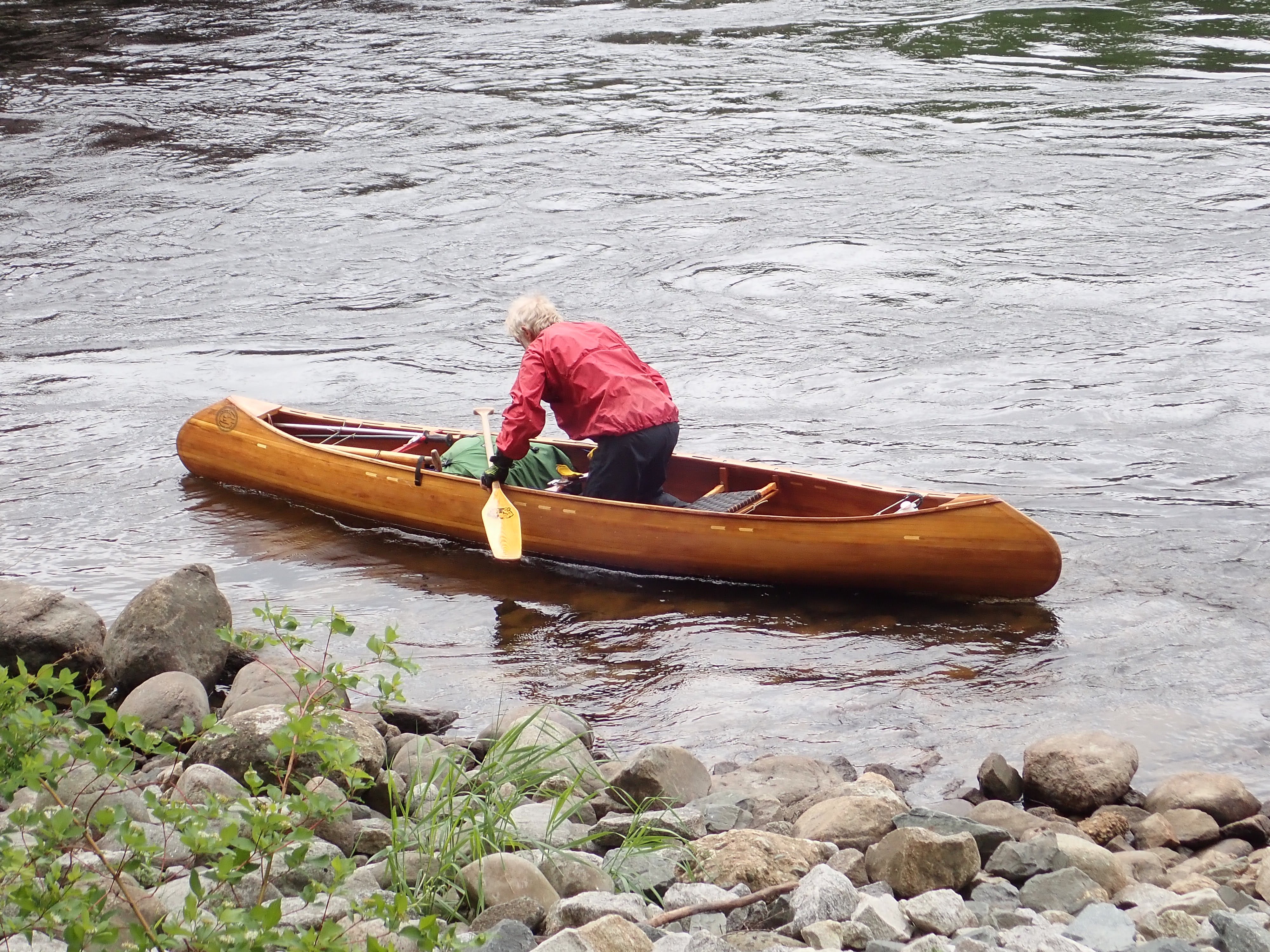 I was up at 6:30 am, for breakfast, somewhat later than had become my norm, and dressed immediately in paddling clothes, despite their rather dodgy aroma. Breakfast was cereals, toast and tea, a change from my breakfast bars, which were not as good this time as last, and so had lost some of their appeal. Just before 8:00 am I was demonstrating my portage technique to Tom and Laurie to return to the river, and was soon heading downstream. Once more the sky was heavily clouded; the pattern of weather seemed to have settled.