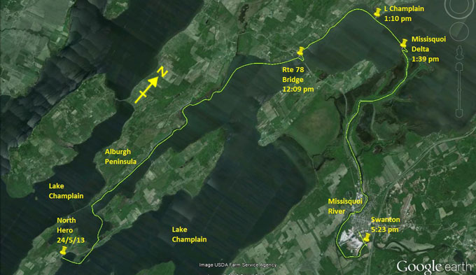 paddling well. All is good except for my hands which are cold. I then beat across the south end of the Alburgh Passage to the east shore