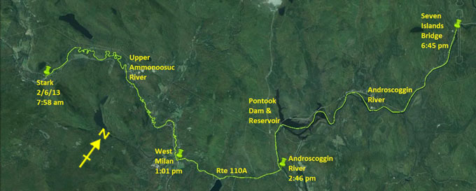 on good terrain with full load. About 200 yards up Route 16 I find the put-in and launch into the Androscoggin. It is flowing well, but