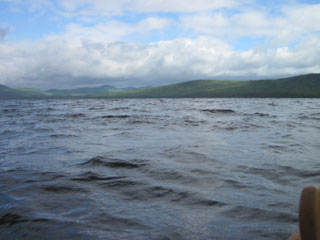 complete the carry and put in to Oquossoc Cove to paddle out on to Rangeley Lake. The strong wind propels me up the lake, and my only