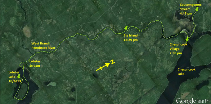 error. Paddling down Lobster Stream is easy with the flow, and my perspective of the West Branch of the Penobscot undergoes a radical