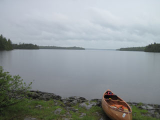 may be very beautiful, comes into view, and before long I'm paddling again as the canoe once more collects rainwater. I head around the