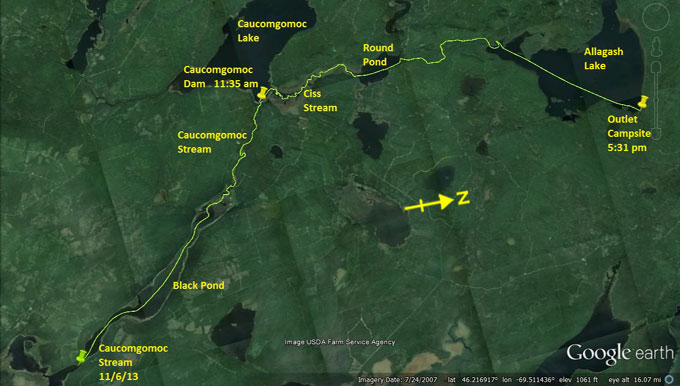 double portion of oatmeal. As I'm completing packing the rain starts. It's 7:00 am. I head up Caucomgomoc stream, having left a supply