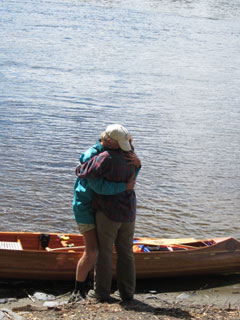 canoe for the last time on this trip and into a long-awaited hug from Viveka. Hildy and Ray are next, Hildy pausing her camera duty for