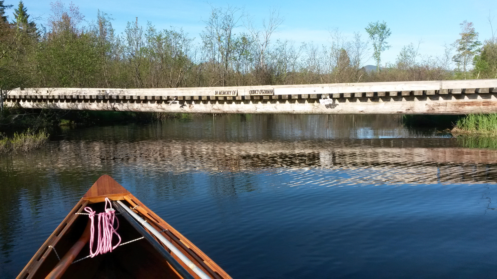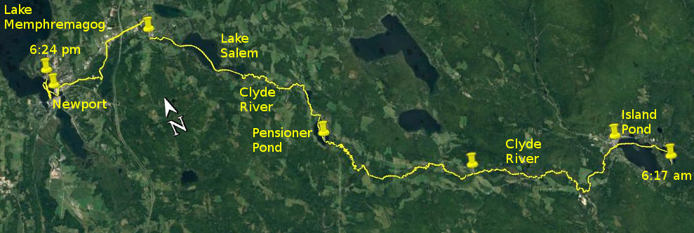 Then my route took me out of Island Pond, under the Clyde River Hotel and into the upper reaches of the Clyde River, my penultimate downstream. With