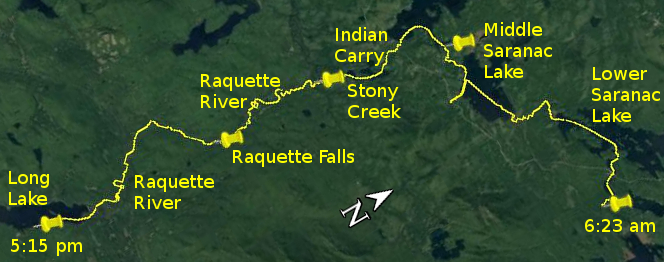 paddle blade. Without trying too hard, but merely by sustaining a focussed effort to optimise my route, I covered the 5.7 miles to Raquette Falls in