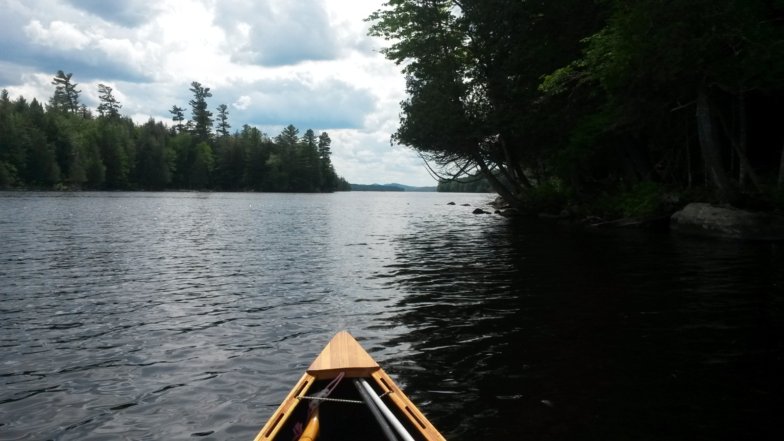 The half-mile carry took less than 10 minutes, and then I set off up Outlet Bay on Raquette Lake, still into the wind but seeking shelter against